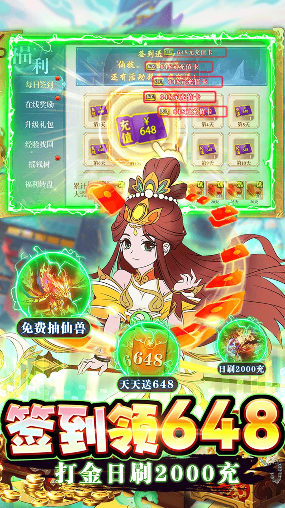 1、上线就送VIP7、88w元宝、1000w银两、1000充值点2、天天登录领648,每日在线送3283、GM工具每天保底打金2000元,海量充值免费激活4、所有神兽任你抓,无需充值也能轻轻松松升至满觉醒5、升级送万元充值,财神红包天天在线领取6、充值比例1:10000(仙玉)