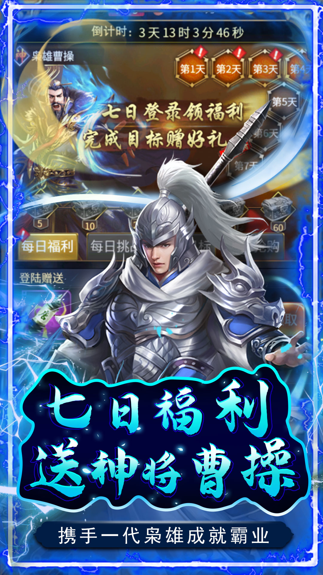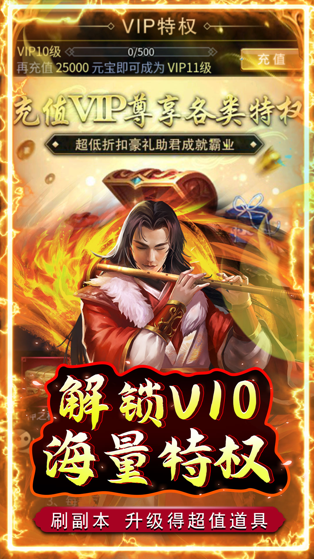 1、创角送百万元宝、GM直充卡(报告中领取)2、刷副本、升级即得充值卡、直充卡等超值道具3、创角免费解锁VIP10,海量特权直接使用4、七日福利送神将-枭雄曹操,成就霸业5、充值比例1:2000(元宝)VIP礼包1元宝购,每日登录送豪礼