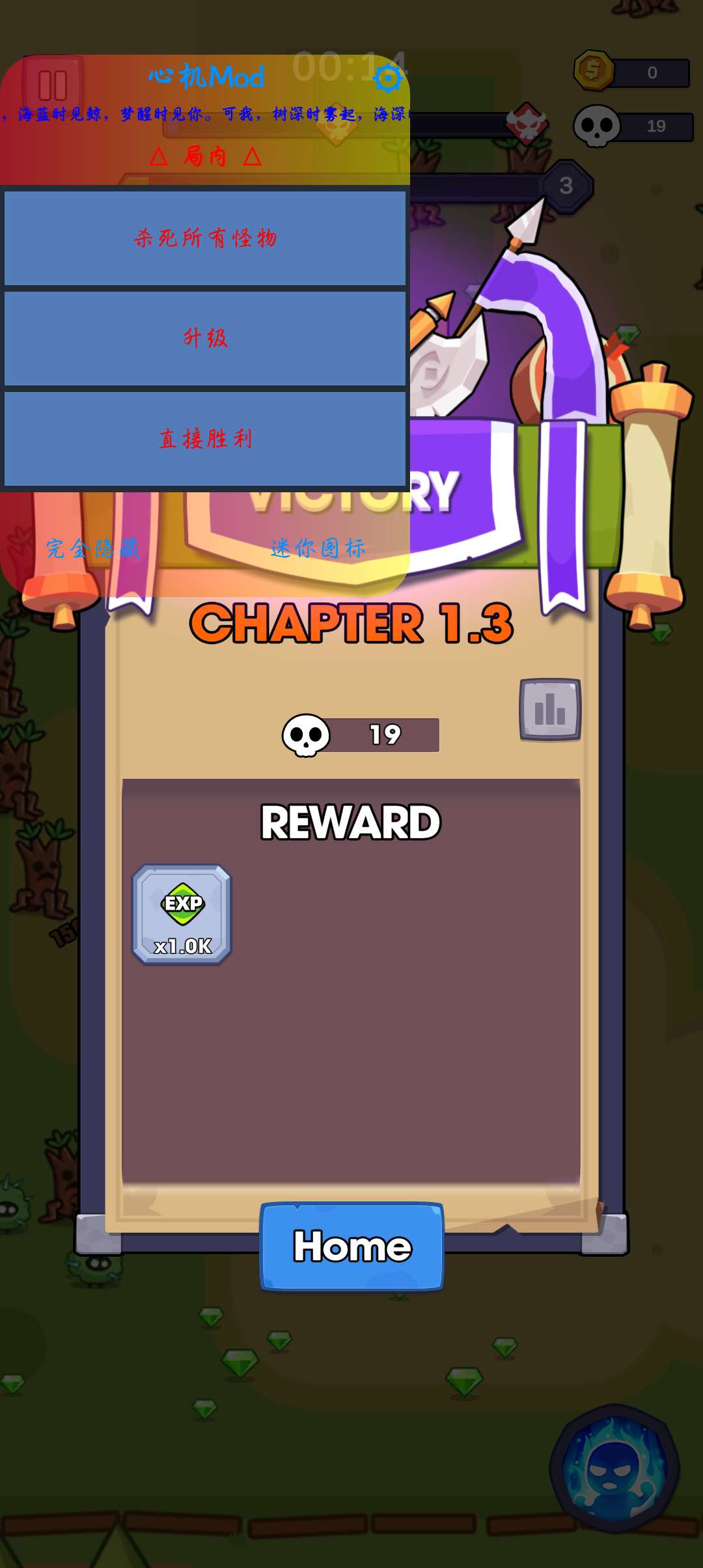 mod菜单1.局内 ①杀死视野内怪物 ②升一级 ③直接胜利2.货币 ①宝石 ②金币 ③技能点 ④英雄卡片3.人物属性 ①伤害 ②防御 ③生命