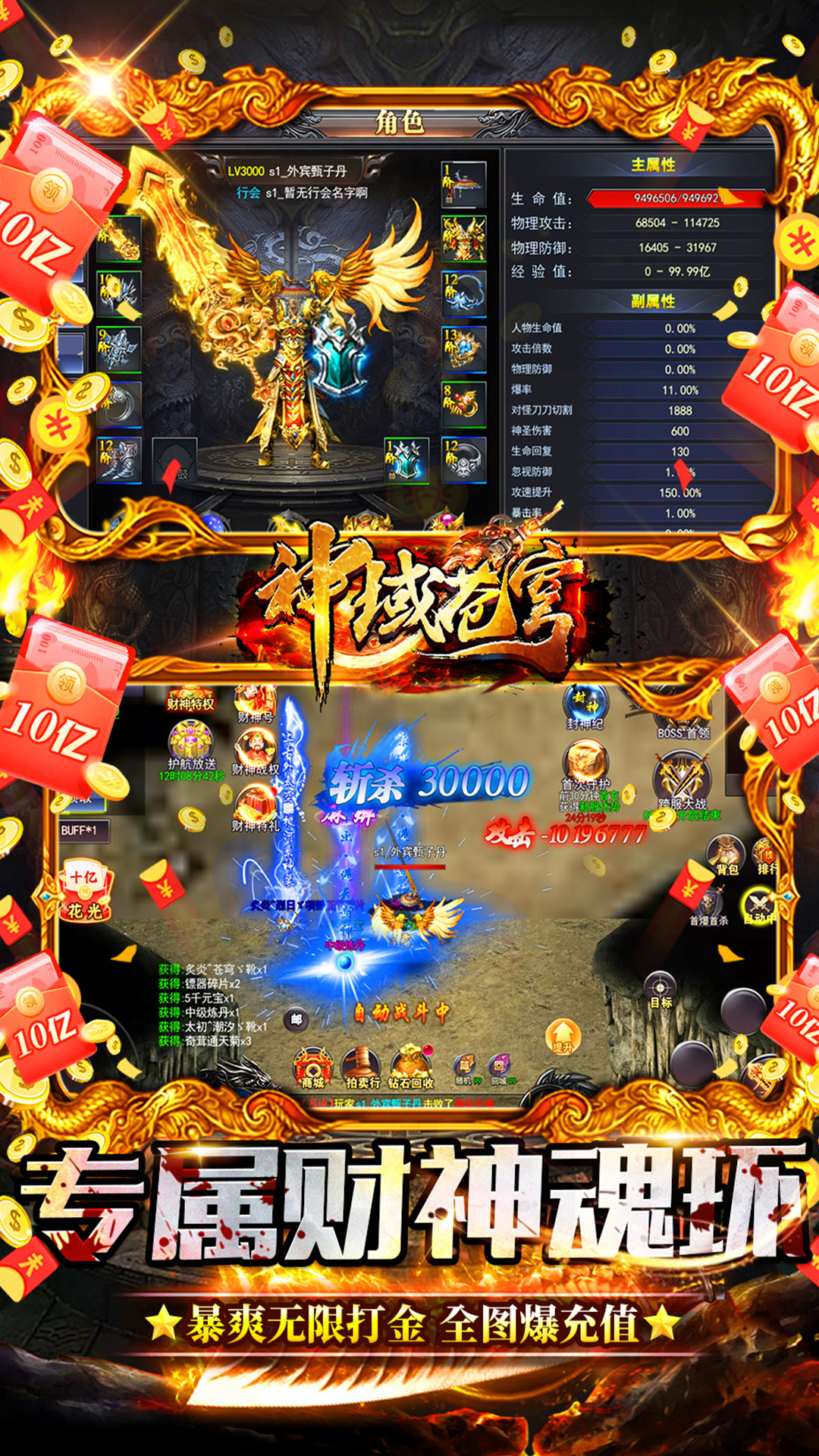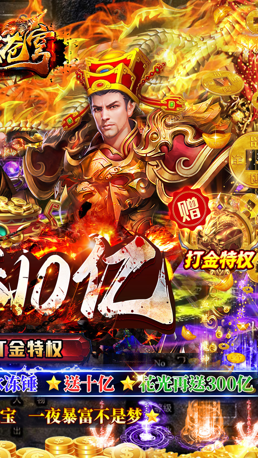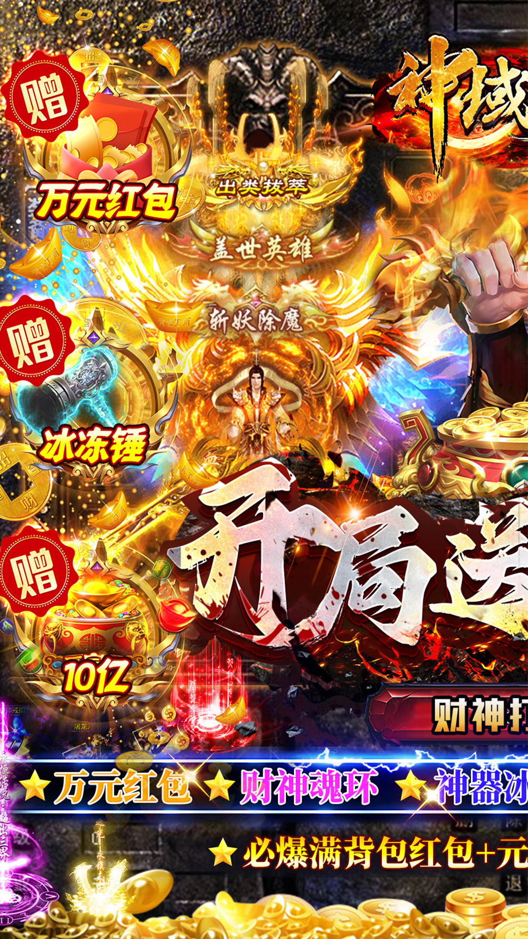 ★上线送万元红包+财神魂环+财神币*1W+财神打金特权★独家福利一:开局财神打金特权,自动拾取免费送!★独家福利二:上线送10亿,花光再送300亿!★独家福利三:专属财神魂环,暴爽无限打金!★独家福利四:独创财神打金,必爆满背包红包+元宝!★独家福利五:送神器冰冻锤,刀刀冰冻!