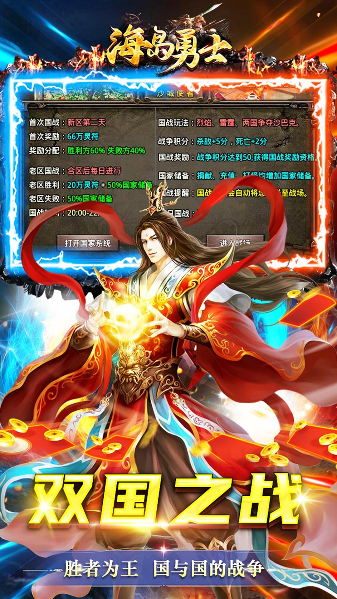 《海岛勇士(国战狂爆打金)》是一款以国战为主题的单职业传奇手游,用两个国家代替了行会制度,玩法新颖,激情更胜!上线就能领取各种特殊物品,更加高效持续打金,满级VIP都是做任务获取,挂机自带全屏吸怪,每天限时活动都是激情满满,千万不要错过。各种福利领不停,快来带领你的将士攻下对方王都,你将会是下个一国之君!