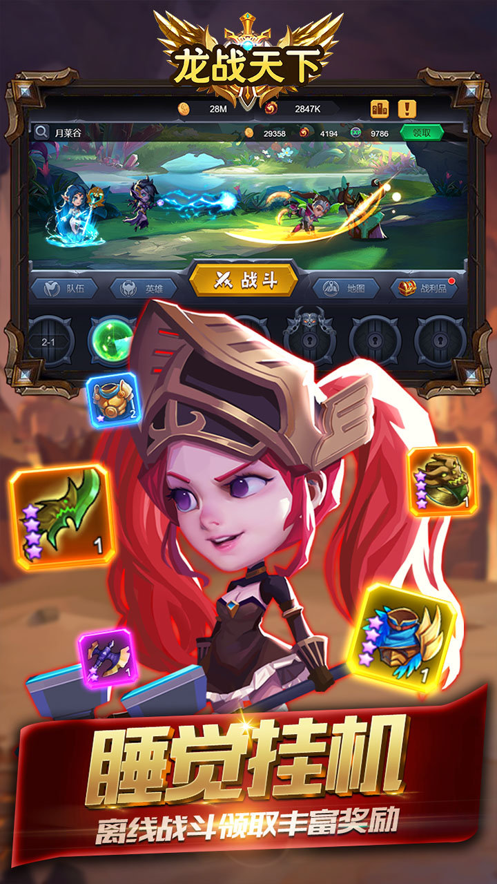 全新异世界冒险放置游戏奇幻来袭。《龙战天下(送抽送真充)》是一款好玩的趣味休闲益智冒险卡牌策略游戏,Q版欧美手绘风格,带你进入华丽缤纷的魔幻世界。放置战斗,指尖冒险,快带领你的英雄小队,开启属于你的传奇英雄史诗!