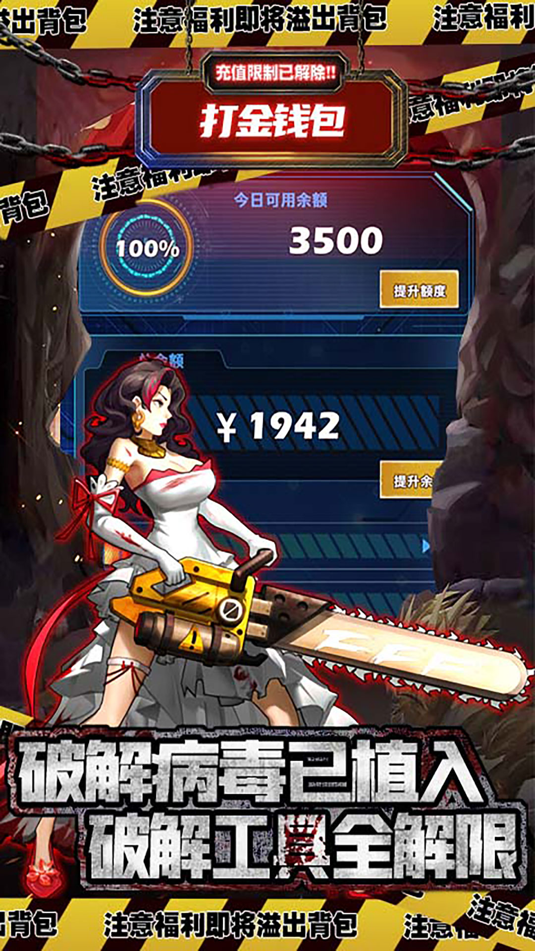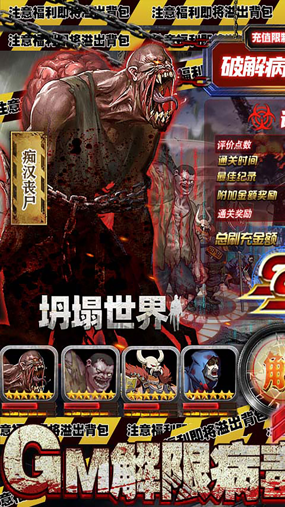 1、创角即解锁末日权限,免费首充送5大GM异化英雄2、爆射丧尸得海量充值金,打金钱包一键充值,氪金0支付3、上线送VIP10,充值比例1:1000,现金挑战,7日送10000000钻石4、基金、月卡、至尊终身卡免费送,在线就得100+抽5、送GM破解商城,礼包0元购,BUG商店助力废土世界6、7日登录送小丑、小丑女,战力大幅提升