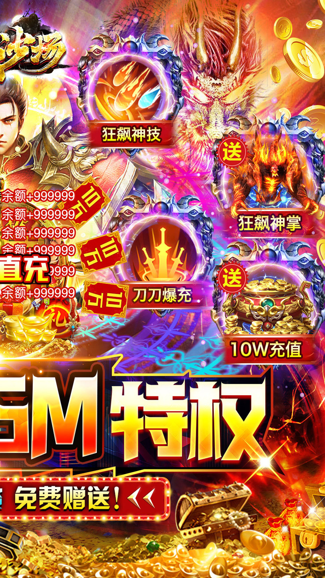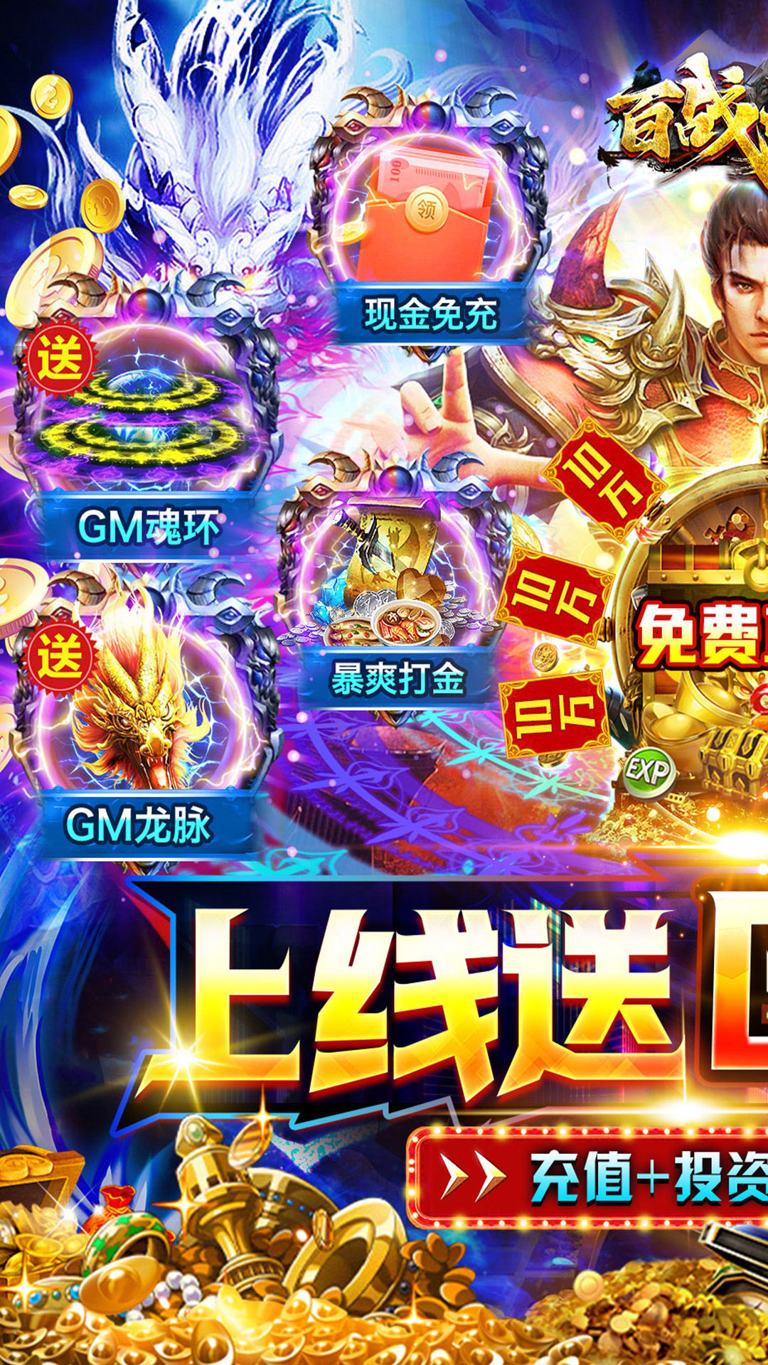 上线送GM破解特权+GM魂环+GM龙脉+GM特礼+狂飙神掌独家福利一:开局GM破解特权,充值+投资免费送!独家福利二:惊喜GM魂环,暴爽无限打金!独家福利三:送神技狂飙神掌,掌掌爆充!独家福利四:超爽送10W充值,花多少送多少!独家福利五:货币比例:1:10000金锭,豪华GM龙脉,无限打金!