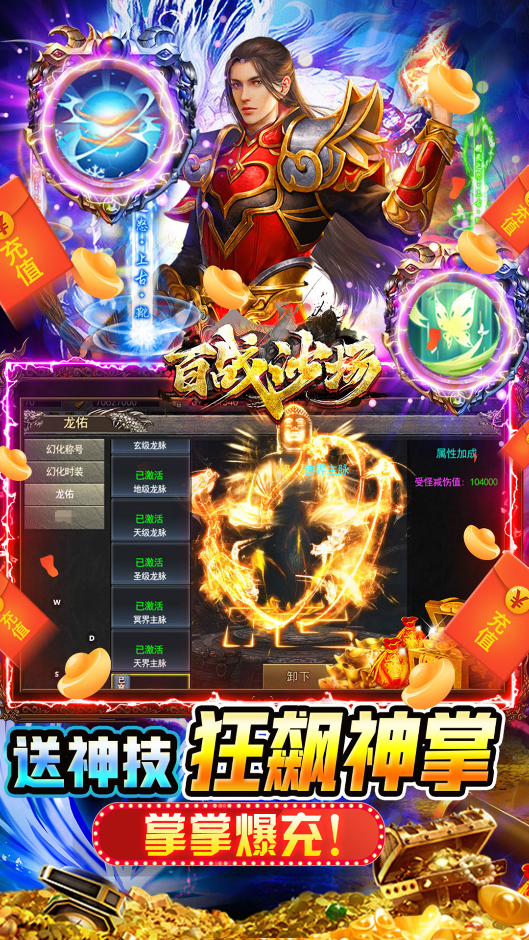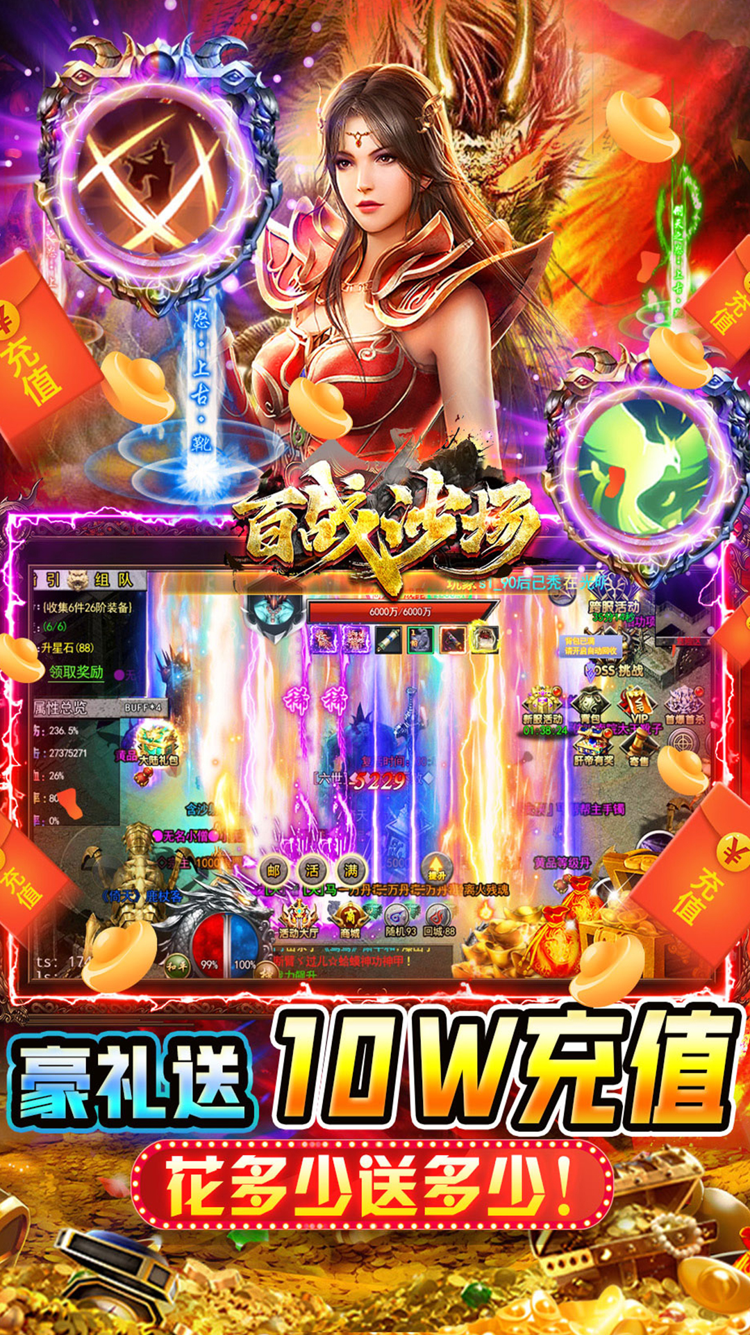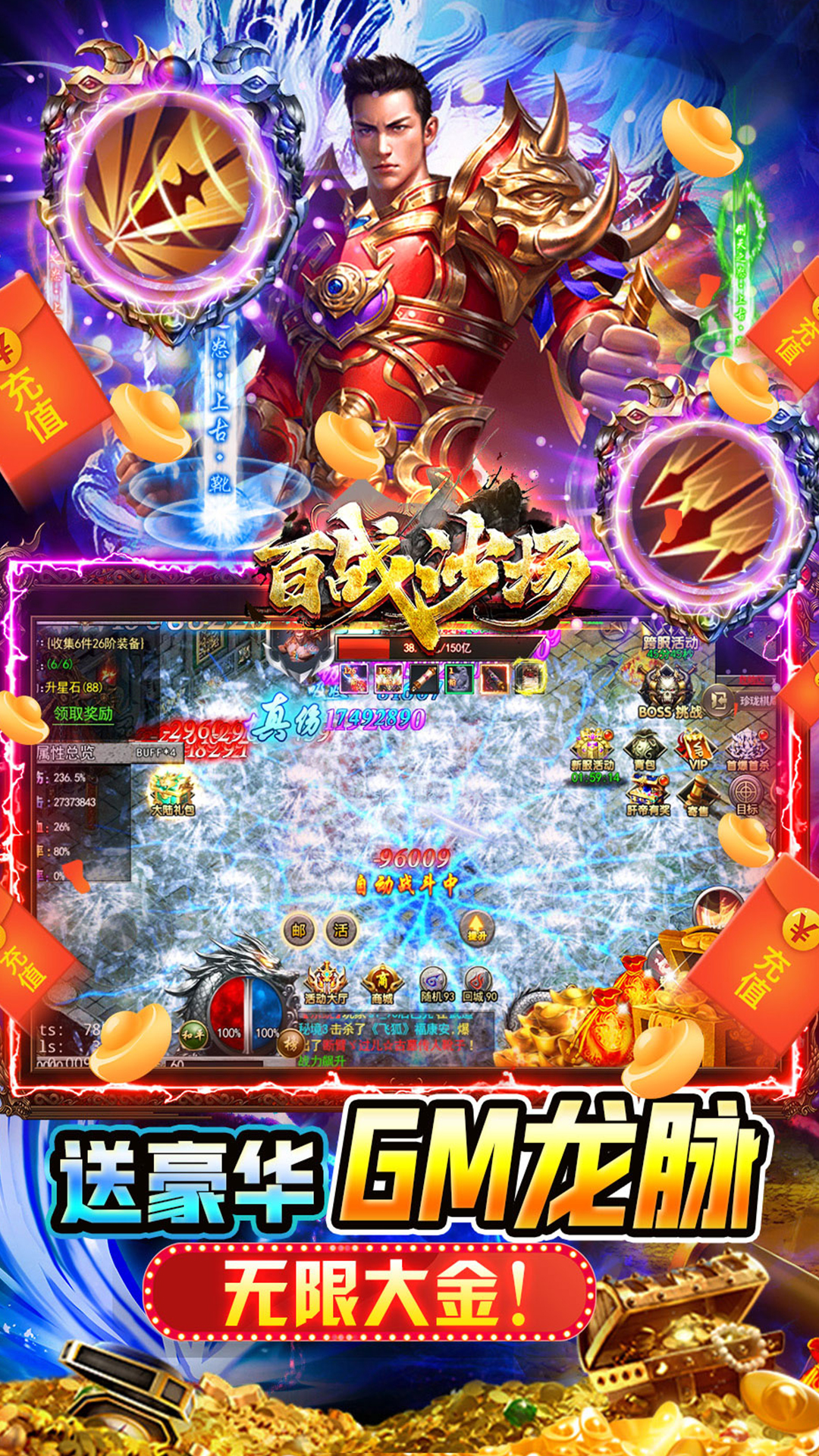 《百战沙场》超爽武侠传奇,开局送地藏时装!再送神技狂飙神掌,称霸沙城、全新专属GM特权,助力霸区暴爽打金!上线送GM魂环+GM龙脉!全图爆真实充值+GM币,首充、自动回收、自动分解全都免费换,独创GM破解传奇玩法,免费送投资,每日礼包,惊喜充值返利,送满级VIP,满福利开局,刀刀爆充!