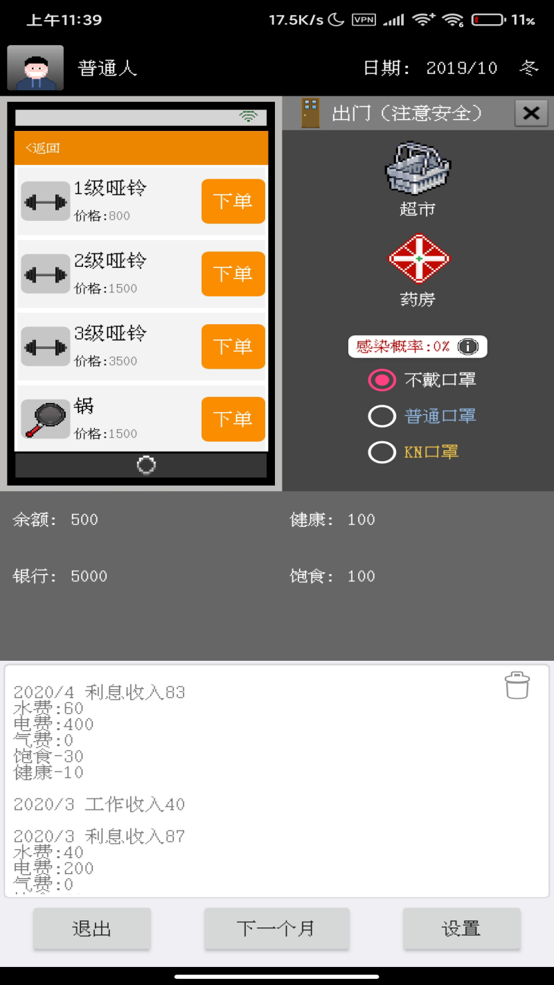 为了生存下去,玩家还需要工作(01 APP)赚钱来购买必需品,比如食物、药品等消耗品,或者购买额外的设备来改善自己的生活条件。另外,在游戏中出门时戴口罩也是非常重要的,可以避免被感染。