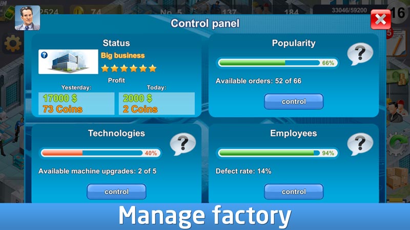 您将获得一个独特的机会来管理一家大型工业企业,从一家废弃的工厂走向行业领导者! 购买机器,雇用员工并开始生产。 研究和升级你的设备。 您企业的成功取决于您选择的策略!
