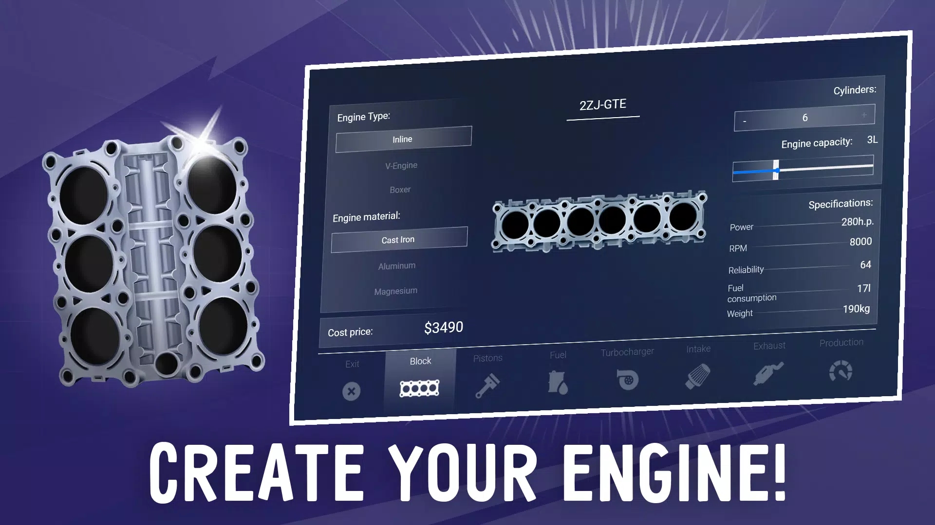 为您的爱车打造完美的发动机:无论是大而强大的 V12 发动机,还是小巧但高效的直列 4 缸发动机,几乎所有常见的发动机布局,各种涡轮增压系统都可以构建。使用详细的引擎设置来提高其性能。