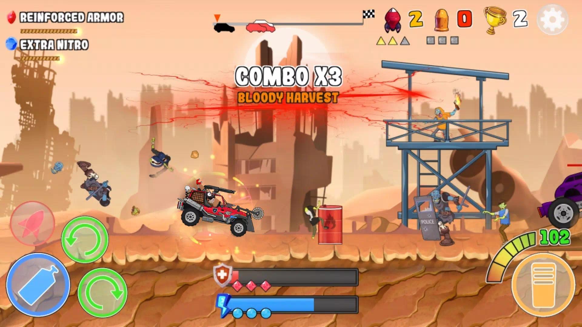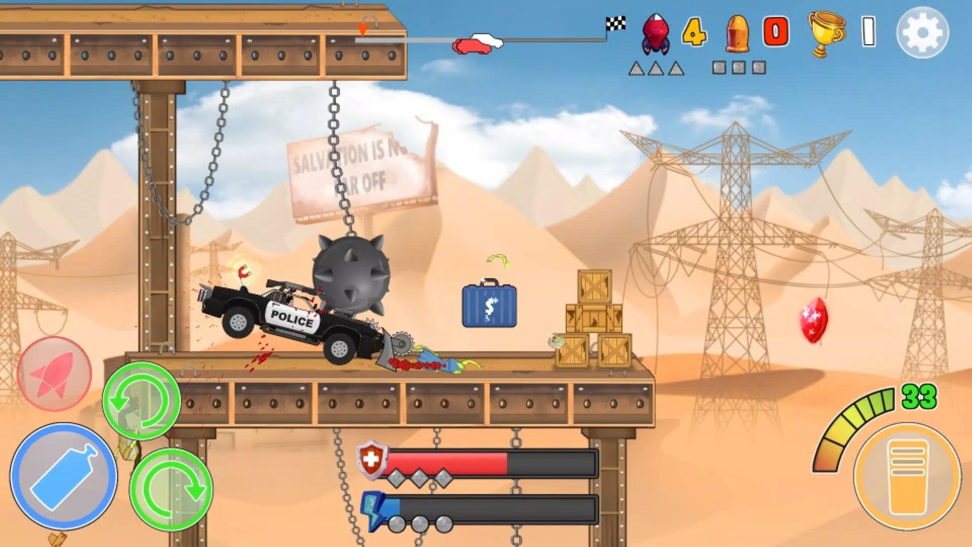 专为在后世界末日世界中生存而设计的僵尸汽车已准备好在感染人群中进行令人兴奋的比赛!在道路和山丘上充分行驶,粉碎僵尸,撞击并绕过对手,用导弹射击他们,以赢得这场汽车和僵尸的疯狂战斗!在铁甲马匹上的街机赛车射击游戏是一款面向射击游戏和后世界末日迷的汽车僵尸游戏!赚取升级,根据速度,装甲和伤害选择僵尸汽车,如何更优雅地粉碎僵尸并粉碎对手。疯狂的 2D 赛车僵尸汽车模拟器会给你肾上腺素!