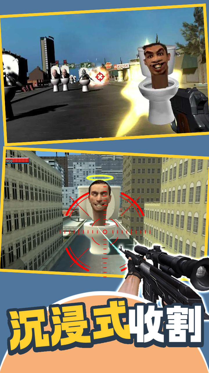 超好玩火爆朋友圈的马桶人生存射击枪战游戏。沉浸式解压收割马桶人监控人僵尸,好玩吧停不下来!