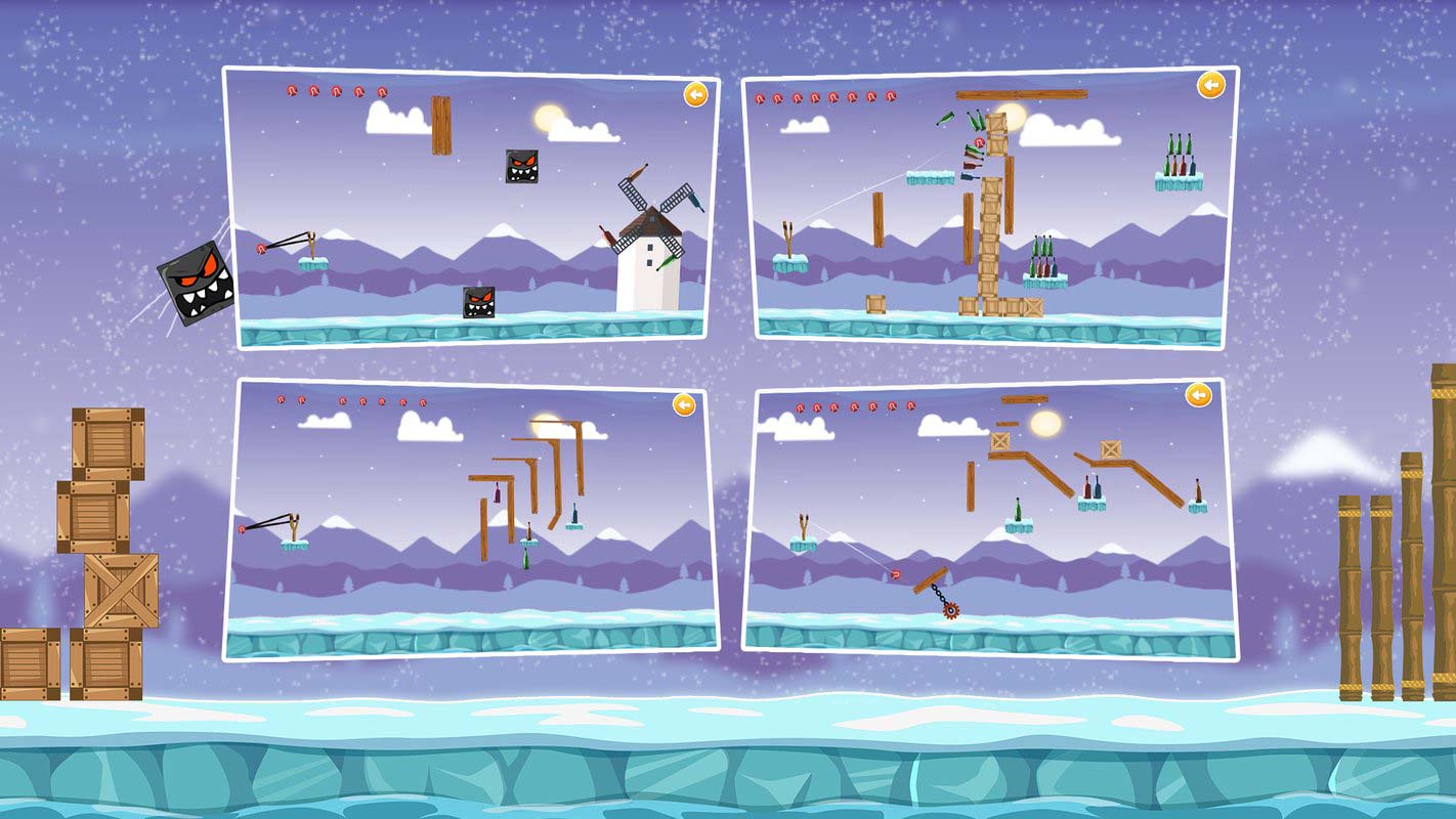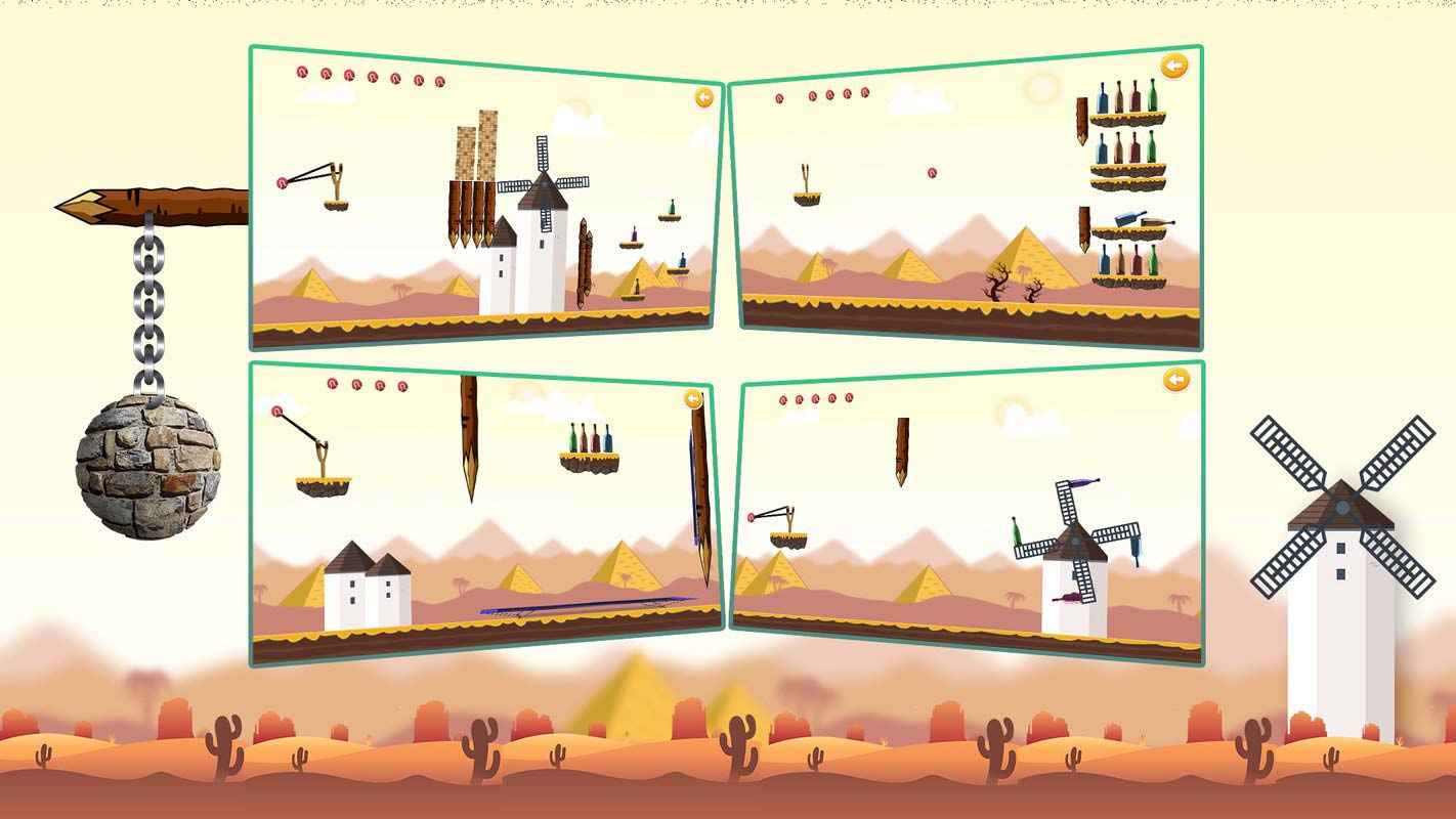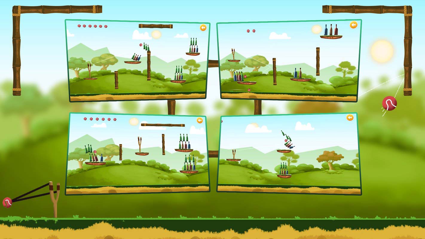 现在打倒瓶子非常有趣,用弹弓打破彩色瓶子。