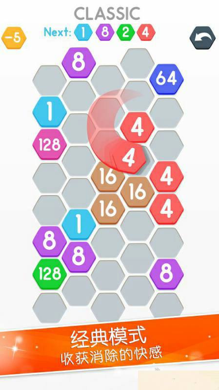 游戏中你将通过连接四个相同数字的六角细胞以获得更大的数字,且每移动一次后都会添加更多个数字,移动和消除的难度也随之增大,游戏有多种模式,喜欢的玩家快来试试吧!