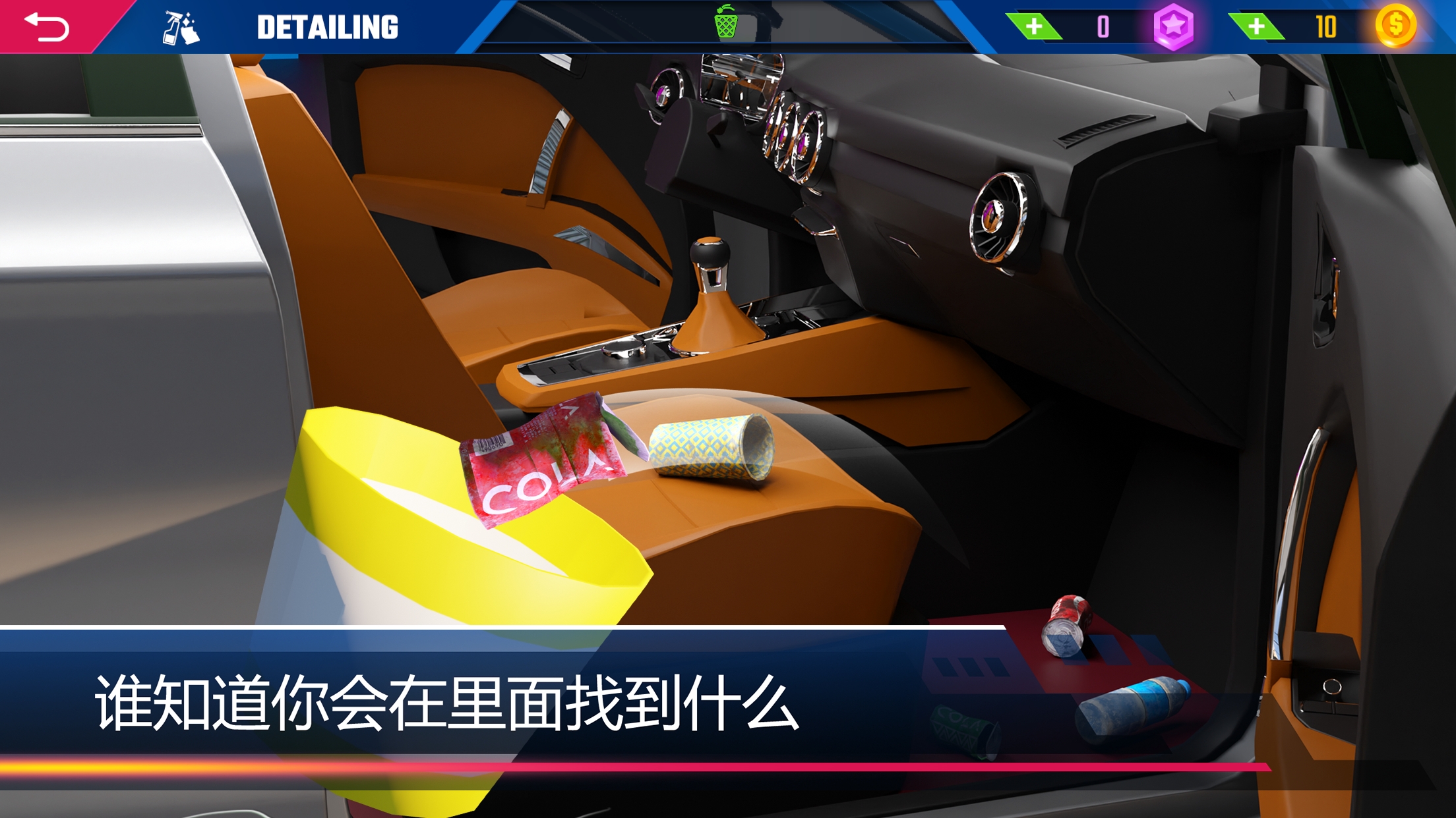 汽车美容模拟将测试你清洗最重要的东西的能力。从肮脏的外部到带软垫的乘客舱,没有一个细节不重要。运用你的技能创造最佳作品,你将获得新车作为奖励,你可以自己保留或在公开市场上出售。