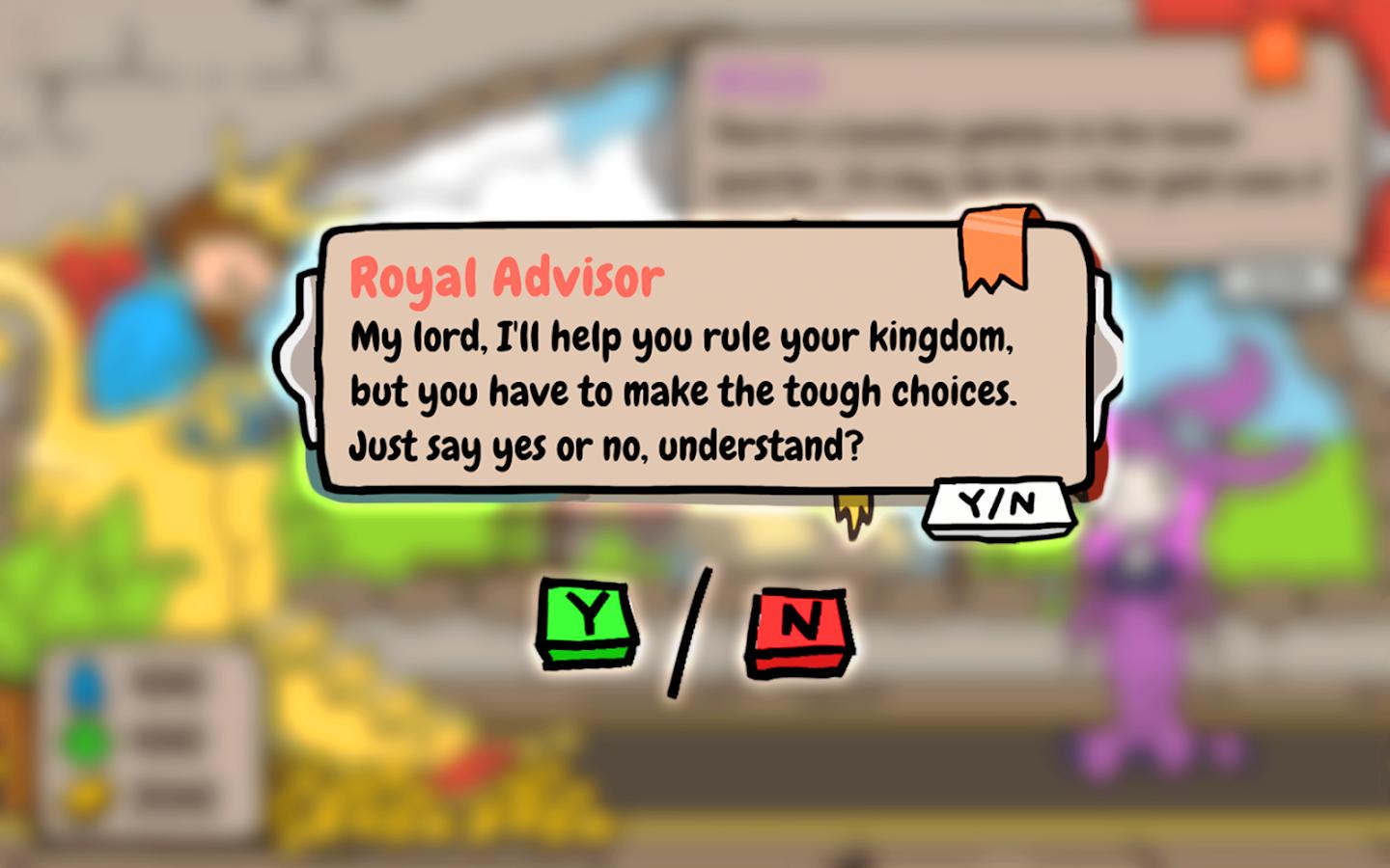 在这款热门游戏的粉丝端口中,您将负责一个不断发展的王国,在您做出影响公民生活的决定时平衡资源和公民的幸福感。雇用和解雇顾问来帮助你统治和管理你的国库,以保持你的王国繁荣。