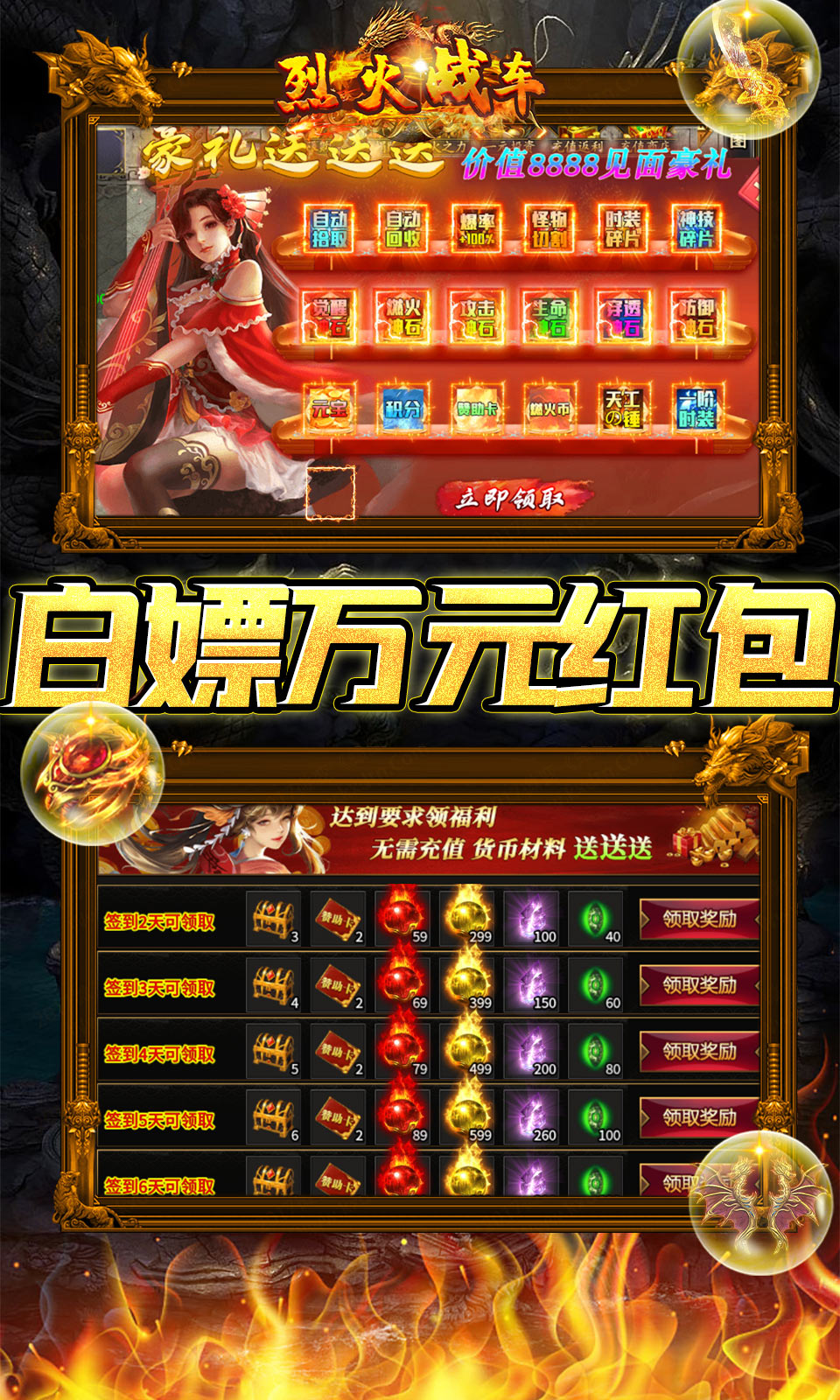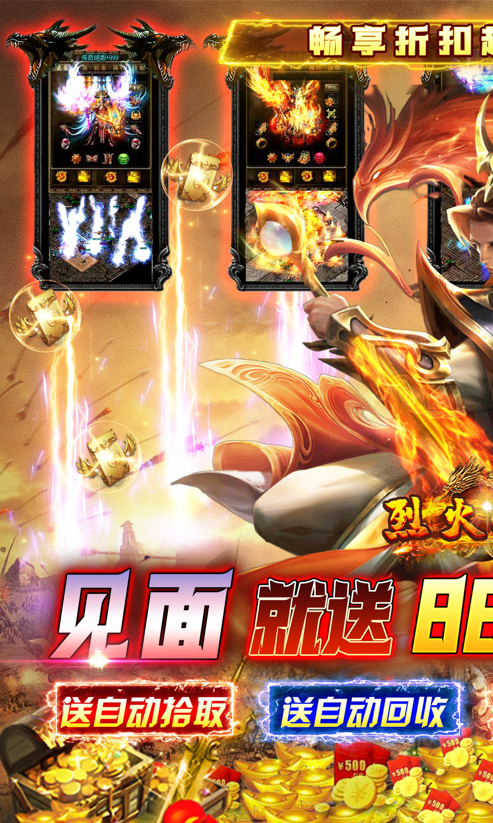 烈火战车(畅享折扣超爽购)上线就可领取自动拾取,自动回收,爆率+100%,怪物切割,元宝,积分,赞助卡,燃货币等等超豪华大礼,无需充值,登录就送!所有充值全部0.1折,福利拉满,诚意可见!五大成就,内含万元充值红包,高阶装备,及超多材料,主打一个“送福利”!乐享天天福利,每日0.1折超值购,最高购88888充值红包海量超值道具!五大全服活动,快邀请你的好友一起来战!无杀戮不传奇!