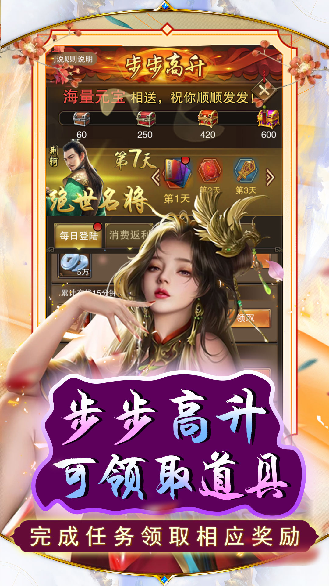 1.邮件领取100元宝2.每日签到领各种道具3.次日登陆领红颜-赵泠4.步步高升,完成任务领取相应奖励5.充值任意金额即送猛将-吕布6.购买成长基金,每日领取基金奖励