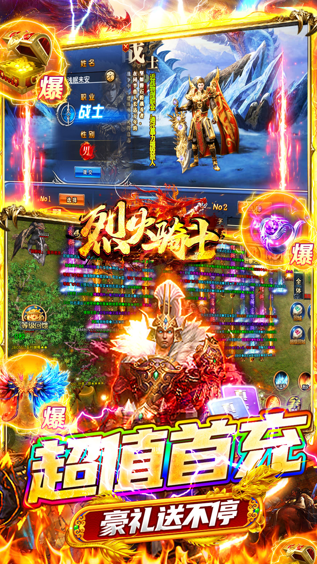 《烈火骑士(0.1折超爆送充爽打金)》是一款高攻速高特效超变版本传奇手游!游戏上线送免费时装和强力技能,免费自带满格背包和超大仓库,完成日常刷怪任务更可获得超多真充红包奖励!首充一元即可领超值豪礼,起步套装、强力配饰、等级直升全部送!更有唯一赞助打金刷充可兑,免费享受超爽游戏特权,做到真正散人爽服肆意打金!