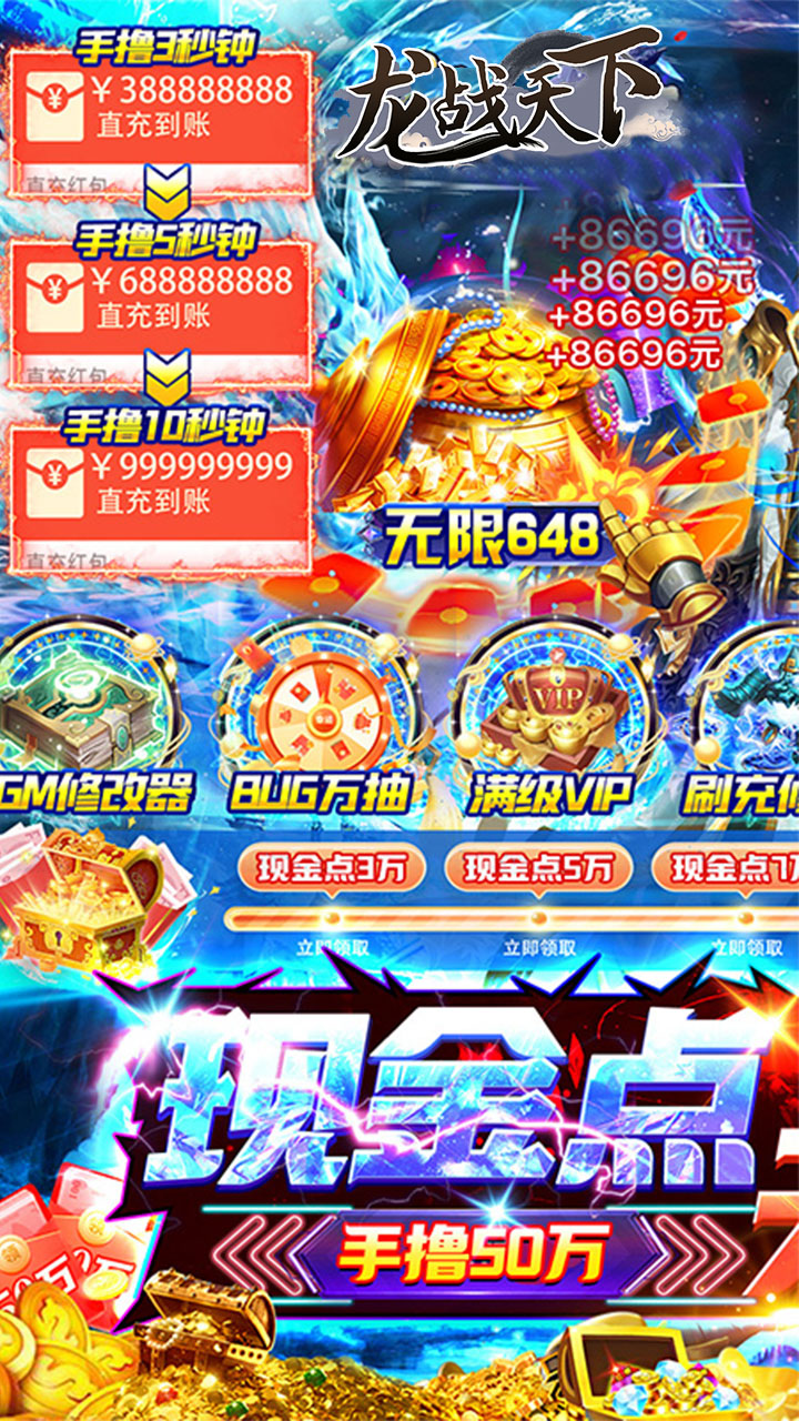 《龙战天下(免费现金点)》是一款特效华丽建模精致的仙侠游戏。开局赠送免费刷充工具,无限撸648元无门槛真充,还可激活累充活动!免费激活伏魔令,洪荒特权、返利礼包等!GM修改器每日免费领取2000万元宝和2亿铜钱!三大职业还原经典修仙世界,修仙修魔修妖任你选择,带您体验创号即毕业的超爽福利!