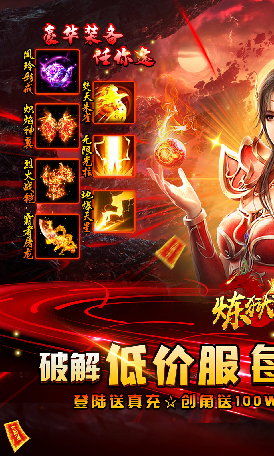 1、创角福利:上线送vip15,元宝*1000000,金币*10000万、绝版时装套!2、折扣商城0.1:进阶版破解商城0.1折大甩卖,货真价实高返利服!每日登陆送648真点充!能拿多少全凭手速!3、充值比例1:10000,首冲最高20倍返利,更多三大豪华投资免费送,助您快速成长百亿战力!4、低价福利1:大幅度调整跨服BOSS爆率,星海切割图腾加大掉落产出!5、低价福利2:每日登陆送大量真充卡,超多动态时装免费送!6、低价福利3:全新补贴商城,福利应有尽有!商城终极装备无限送!