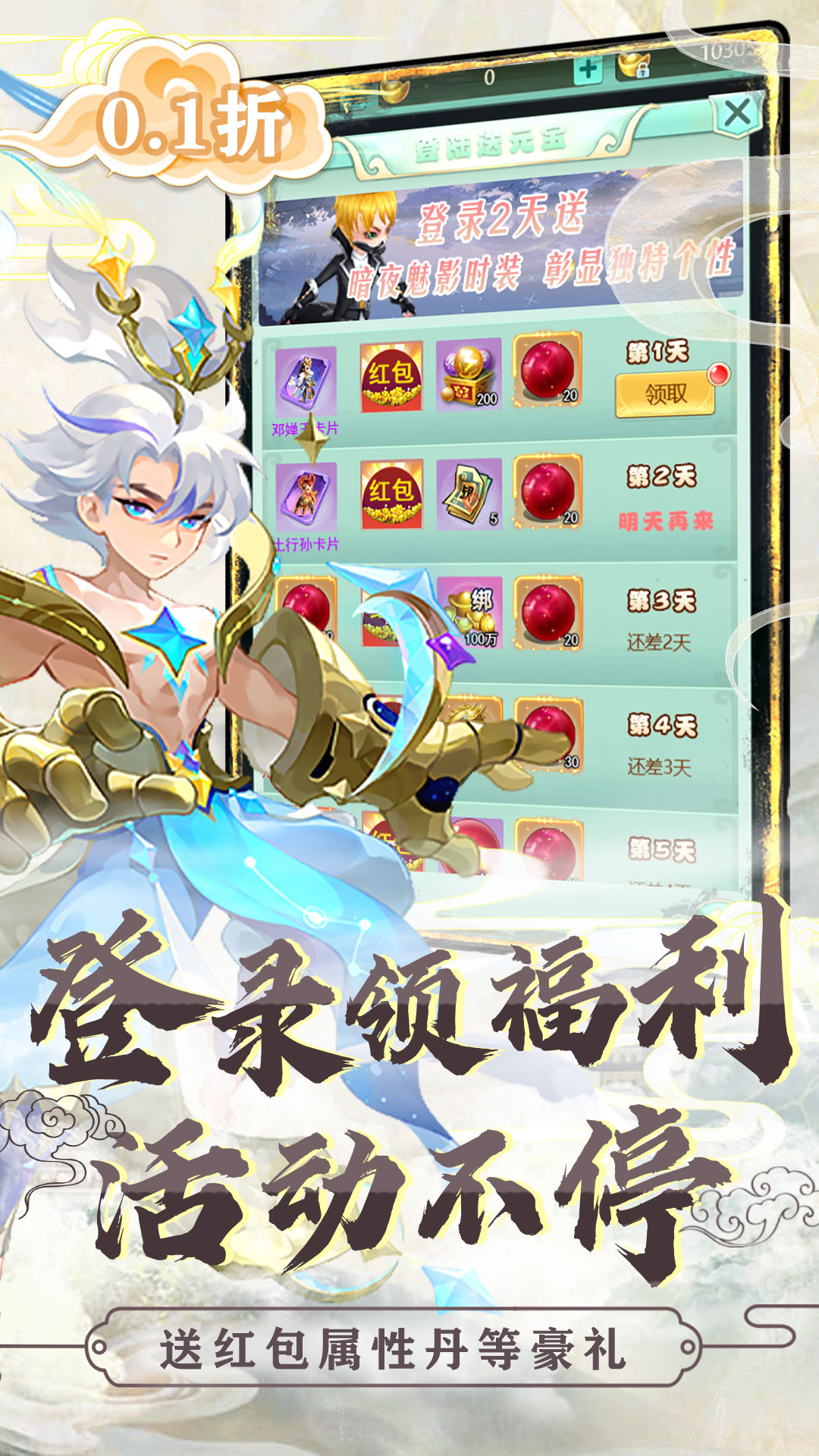 1.创角即送送VIP20、648红包,VIP礼包免费领取2.开局百万绑元、8888元宝直接领取3.登录7天送豪礼,红包、属性丹等豪礼免费获取4.副本、竞技、BOSS玩法赢海量道具