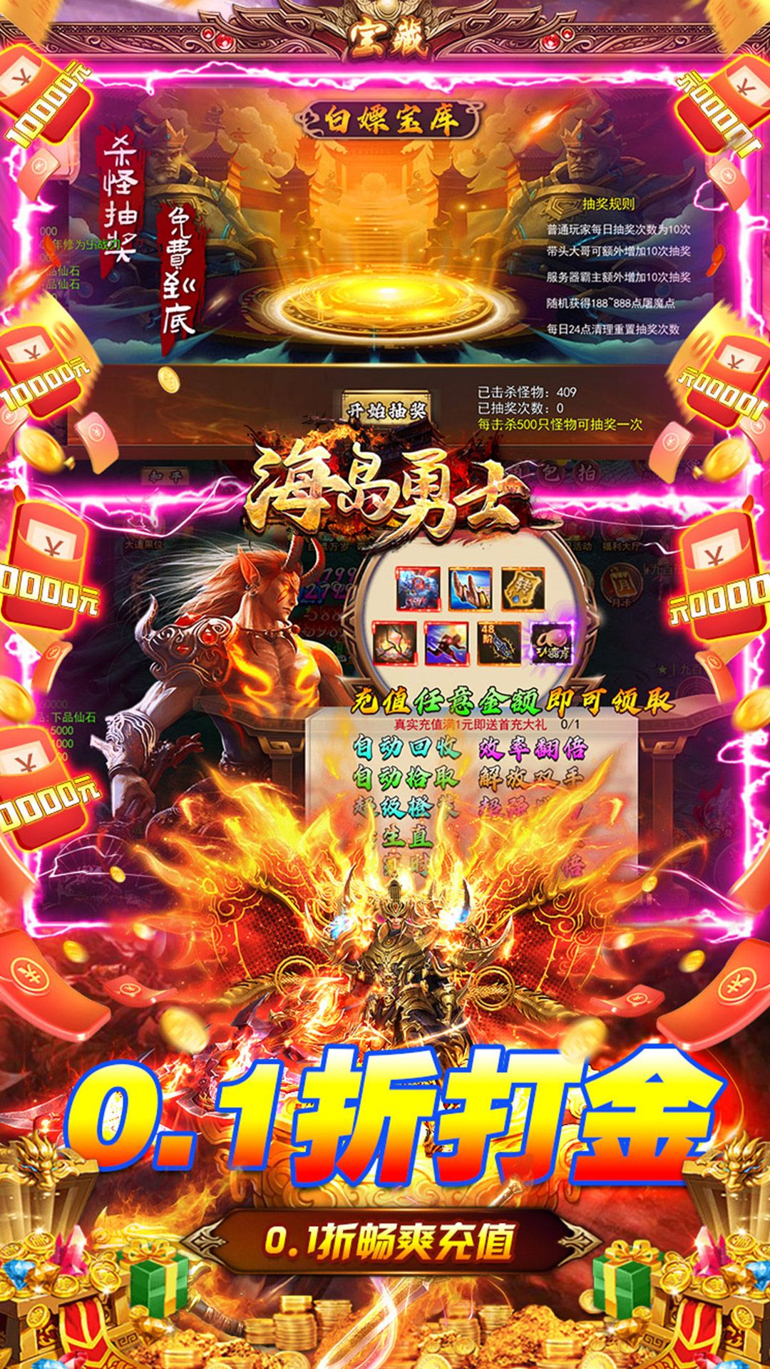登录送时装:剑神+180000功德点+刺杀技能书+下品仙石★充值永久0.1折★1元首充送自动回收+自动拾取+转生直升+独家时装!★诛魔悬赏完成领海量福利!★送时装:勾魂使者!★送翅膀:冰火魔翼!★送坐骑:冰霜狼!★送神印:烈焰之印!★白嫖万岁:杀怪抽奖,免费到底!★破劫证道完成送法术技能,大量功德点!★登录即送十亿GM币,花完再送300亿;