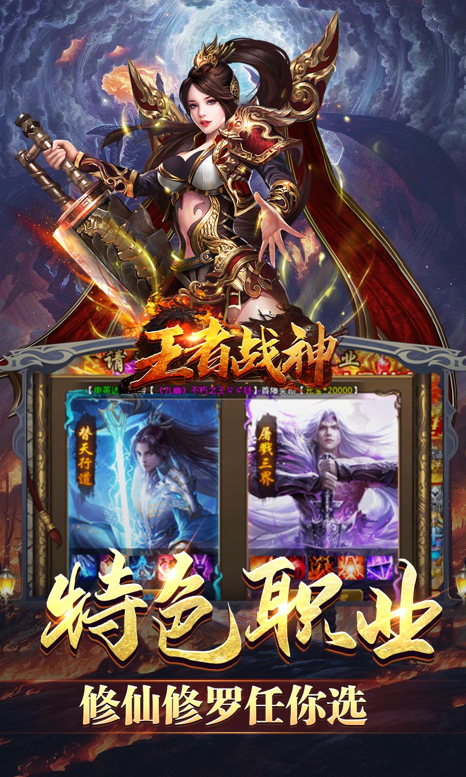 王者战神(爆充神器超变)是一款全新超高爆率超变传奇手游,特色职业!修仙修罗任你选!