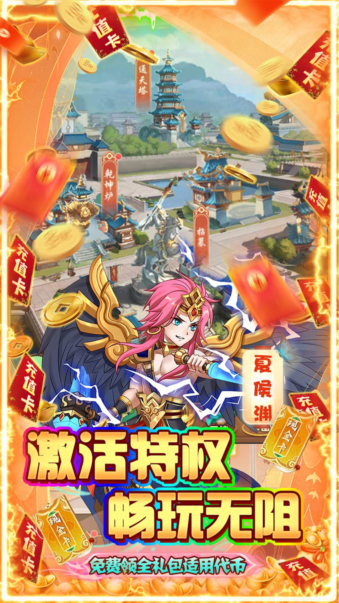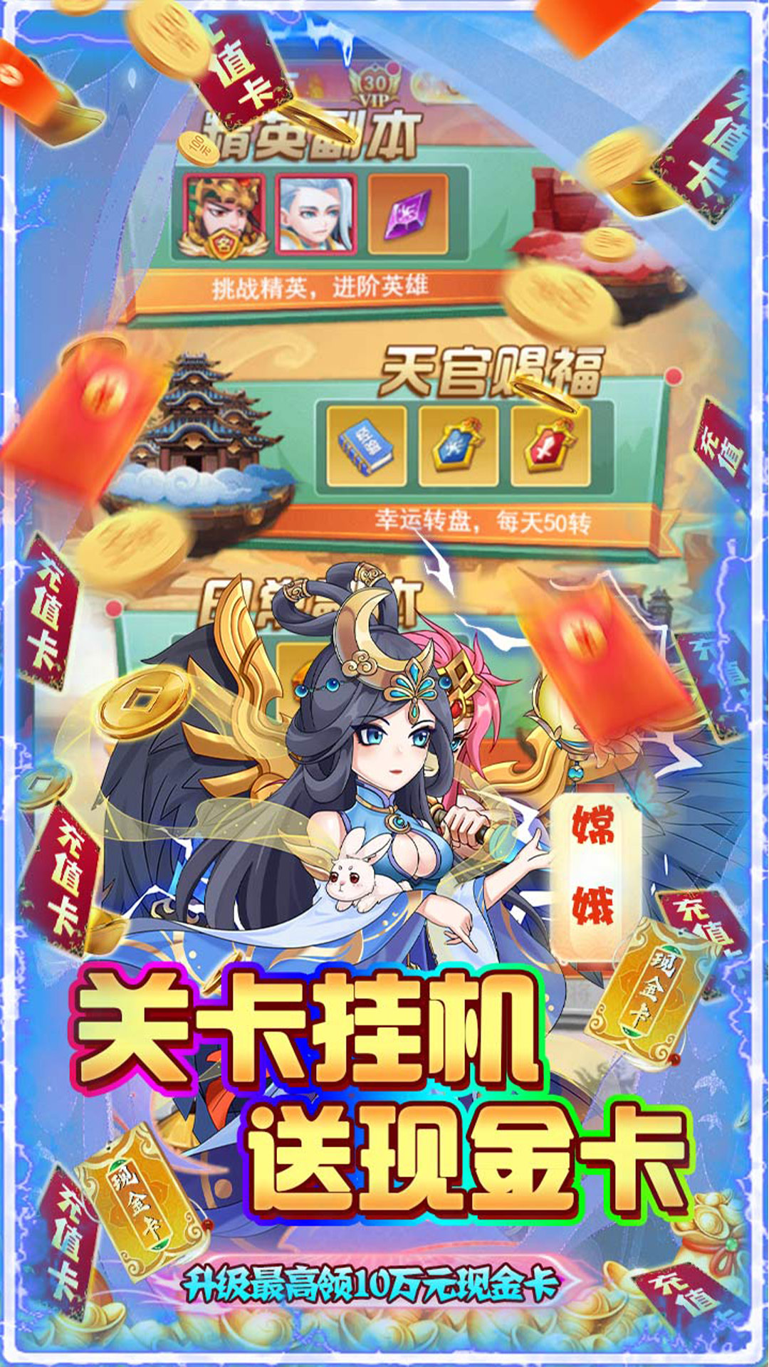 1、进入游戏立送VIP30、千万元宝、千万铜币2、激活特权畅玩无阻,免费领全礼包适用代币3、关卡挂机送现金卡,升级最高领10万元现金卡4、首充豪礼免费送,直领无双黄忠、孙悟空、关羽5、后台商城,各种珍稀道具仅1元宝带走6、通关、挂机、签到、登录海量资源领不停