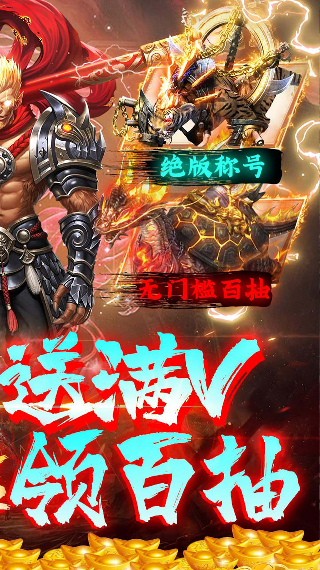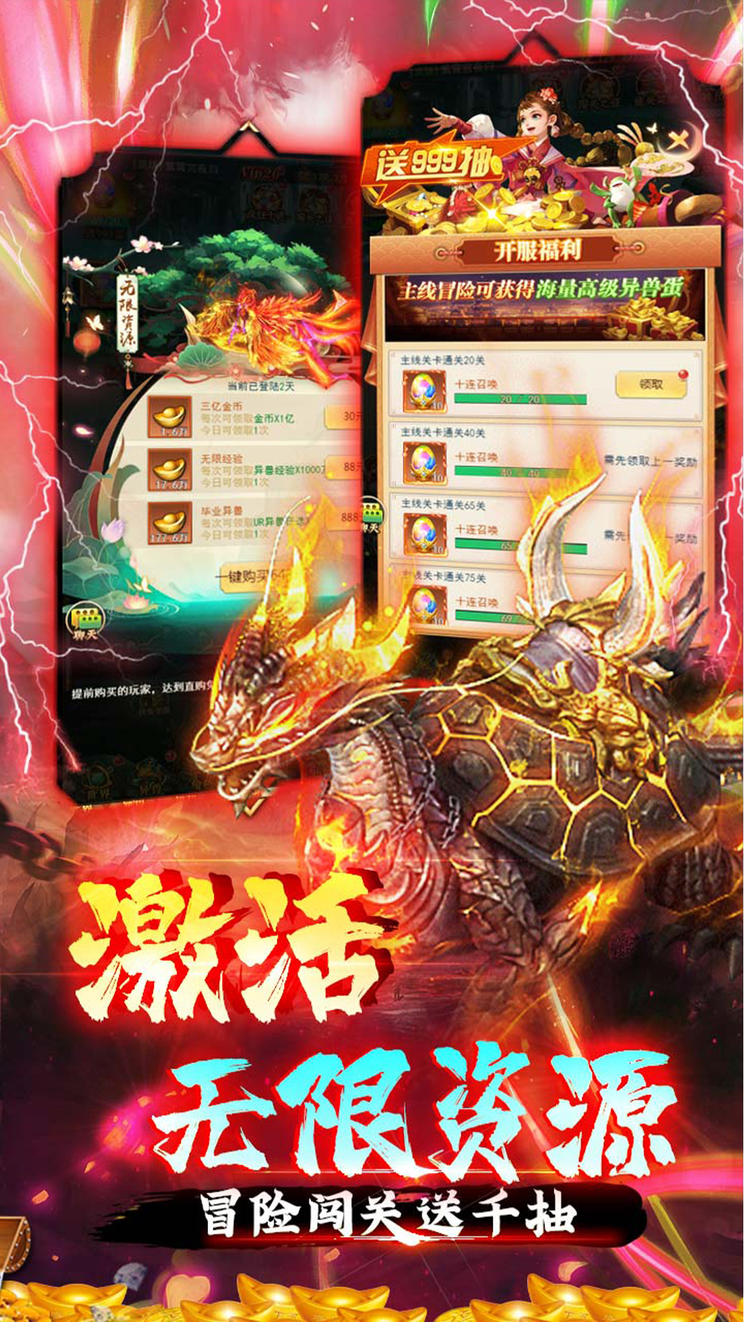 创角送满V:创角即送满级VIP、绝版称号、无门槛百抽、GM专属礼包日常领资源:每日日常完成任务,活跃度无限送元宝卡升级领万充:每提升一个阶段等级即可领取对应充值卡,共计领取十万充豪礼日日送:每日登录直送百抽,资源根本领不完闯关领千抽:冒险闯关直送千抽专属异兽等你抽取