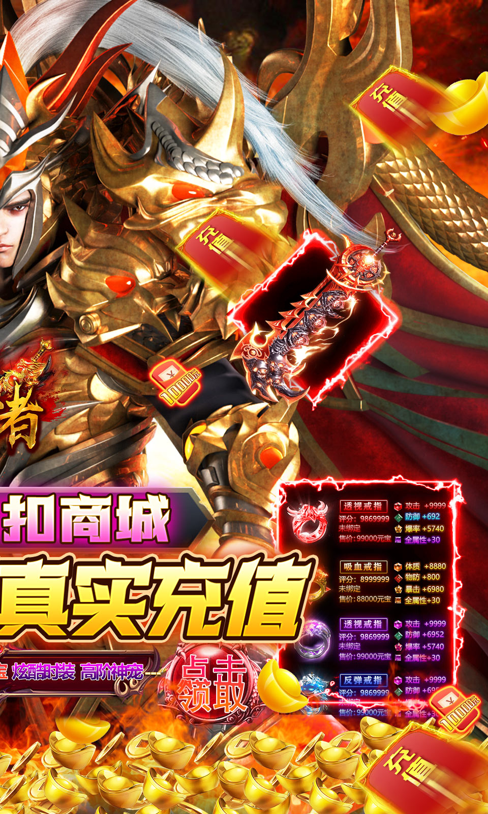 1、上线送满vip,免费激活特权,100万元宝、10亿金币,绝版时装套!2、开局激活免费特权,每日领取648真充,激活所有线上活动!3、充值比例1:10000,首充最大20倍返利,连续三日领取超值豪礼,更有三大投资直接送!4、爽爆福利1:全新福利升级0.1商场版本来袭!每日低至0.1折商城出售。各大系统装备道具时装均1折上架,先到先得!5、爽爆福利2:每日登陆送点充648,大量真充卡任意送,根本不需要充值!6、爽爆福利3:全新GM商店大改版!全系列的至尊雷霆免费送!终极魔神海神套装免费兑换