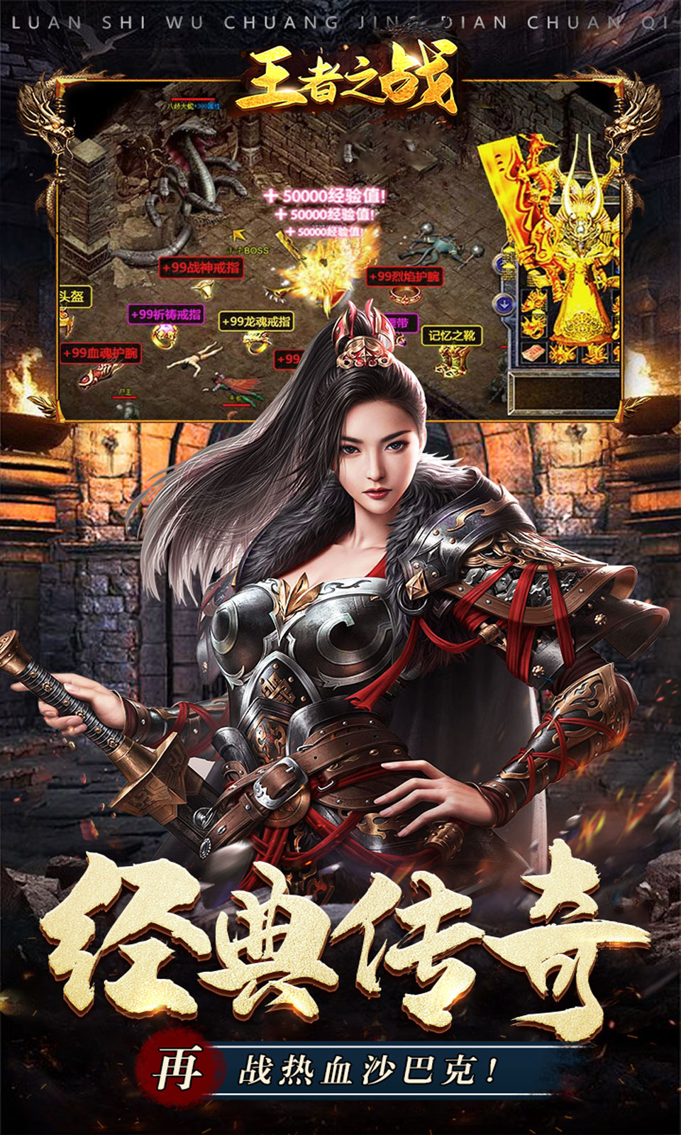 《王者之战》是一款经典复古传奇手游,散人追梦,超多装备!上线送新手装备、自动拾物、自动回收、vip1会员卡、10元充值红包!超值装备!上百张地图精彩纷呈,等你来战!游戏中还有热血沙巴克活动,集齐你的兄弟一起血战!超多奖励等你拿!