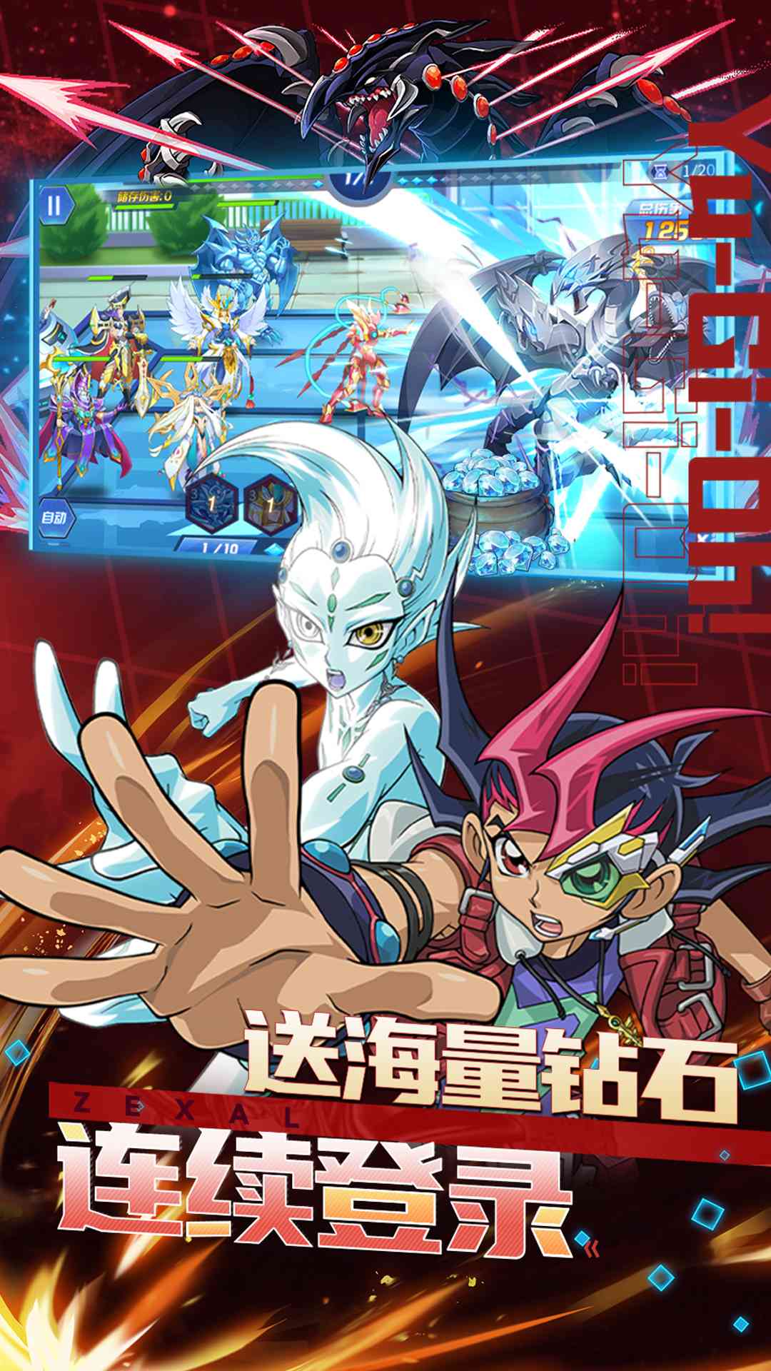 1、游戏内所有充值0.1折。2、连续登录送21000钻石。3、次日送五星卡牌。4、通关章节送五星稀有英雄。