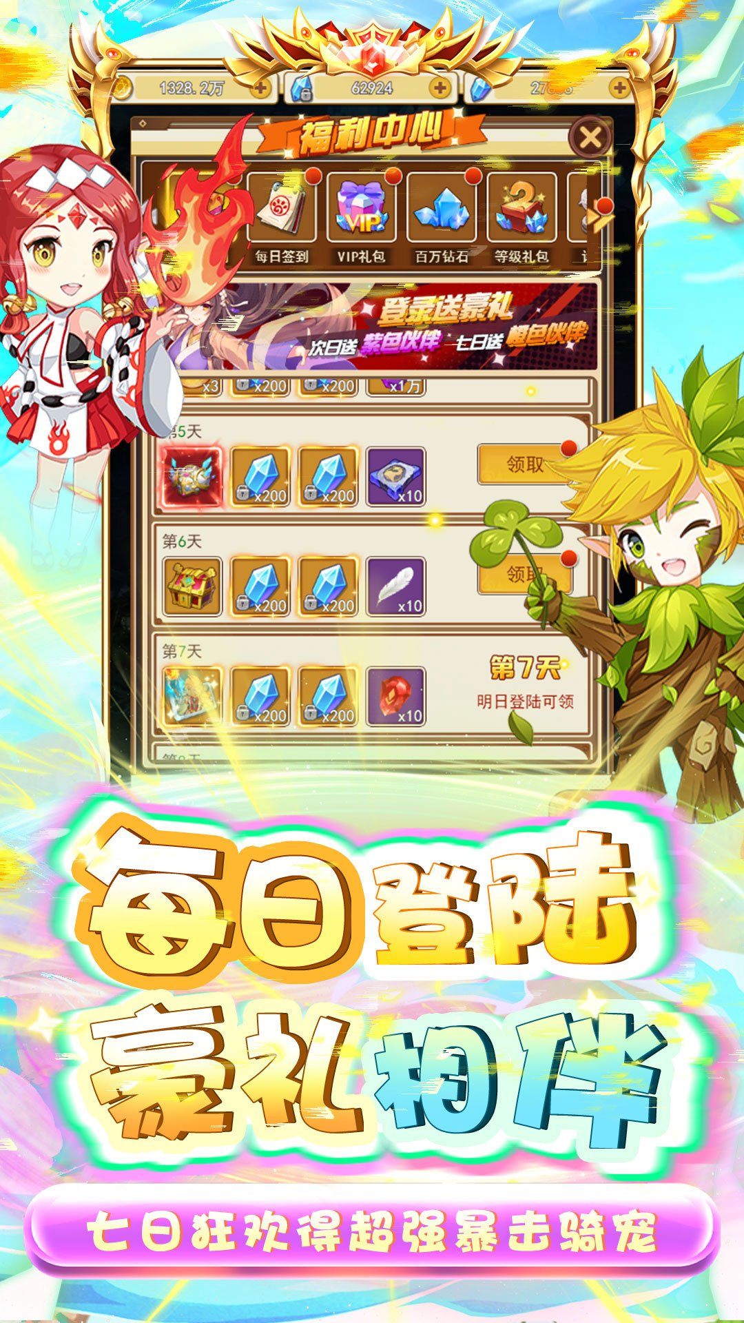 1.上线即可领取V7,VIP礼包每日免费领取!2.七日狂欢得超强暴击骑宠!3.累登累计百万钻石等你来拿!4.每日登录送钻石、稀有装备、伙伴!5.挑战送图腾、神宠,超强控制,恐惧全场!