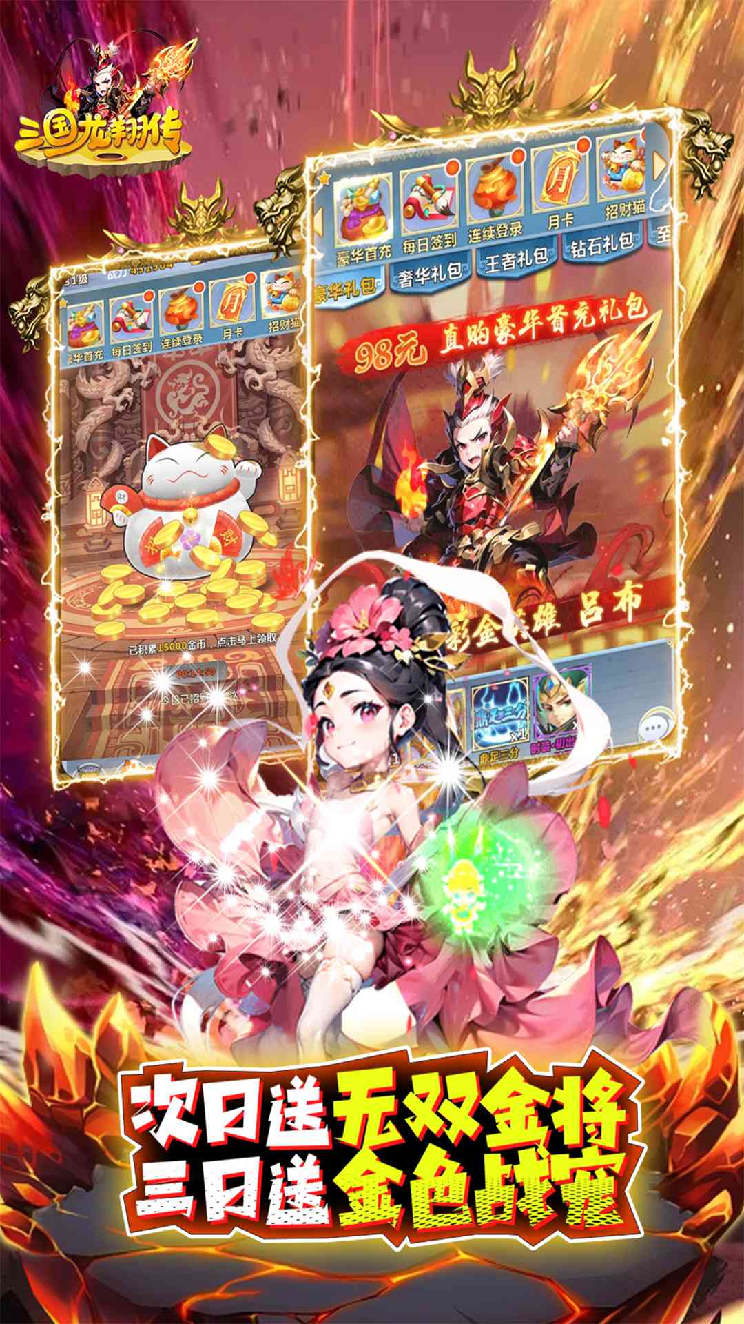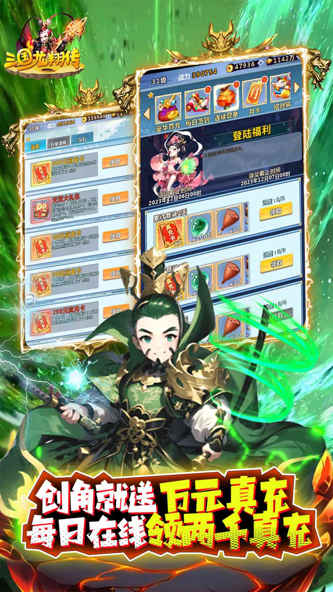 全新0.1折版,所有充值统统0.1折。现在登录游戏创角还送免费无双特权、200无双币、VIP15、一万元真充卡、888万金币、888888元宝、5000体力。福利满满,助您征战三国世界!