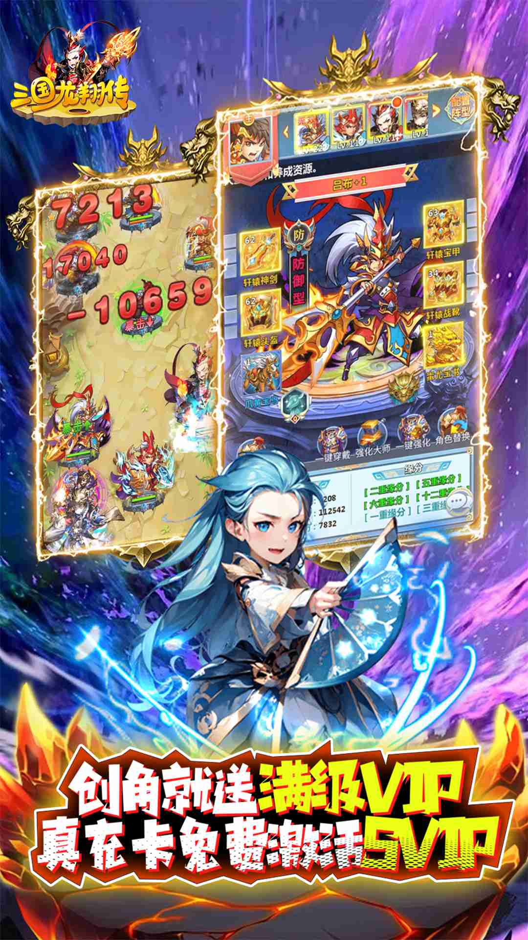 这是一款三国策略卡牌,融合放置类游戏经典的同时还包含了丰富的游戏内容:放置、战斗、收集,养成、任务、竞技场等!战斗过程无需操作,阵容搭配充满策略性。主线剧情生动有趣,经典玩法妙趣丛生。