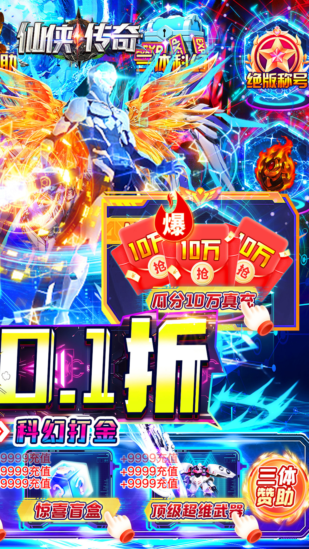 《仙侠传奇》独家三体科幻传奇,所有充值全部0.1折,数值不膨胀,全新超爽无暗坑!所有装备高爆率体验!登录即送体验时装:秩序+满级VIP+顶级超维武器,所有高阶装备可以依靠合成进阶!超级全民打金瓜分10万真实充值,更有全新混沌至尊活动,打怪再送全部三体赞助,惊喜盲盒抽奖,有概率抽出【开天】神兵,上线送顶级超维武器思想钢印、纳米飞刃、降维二向箔,独家克隆人系统,助力称霸宇宙!
