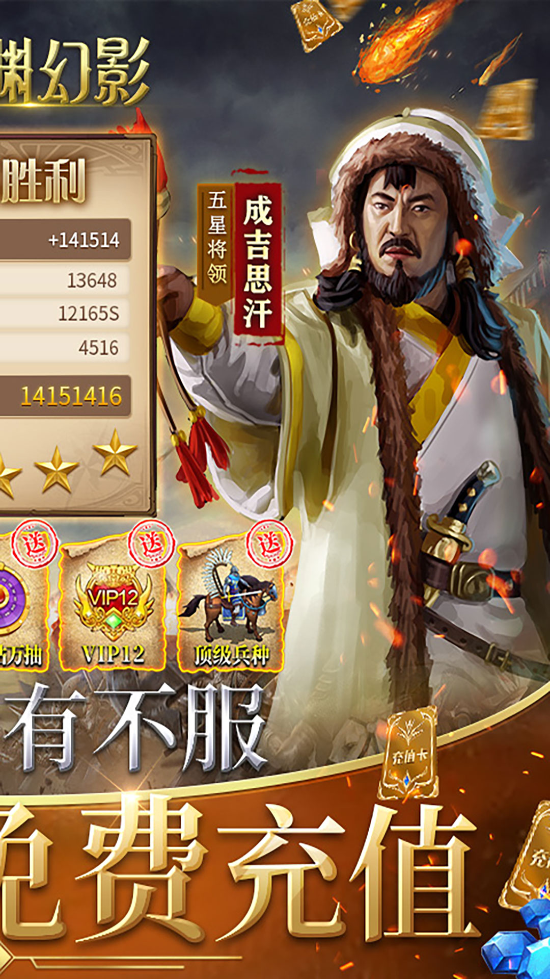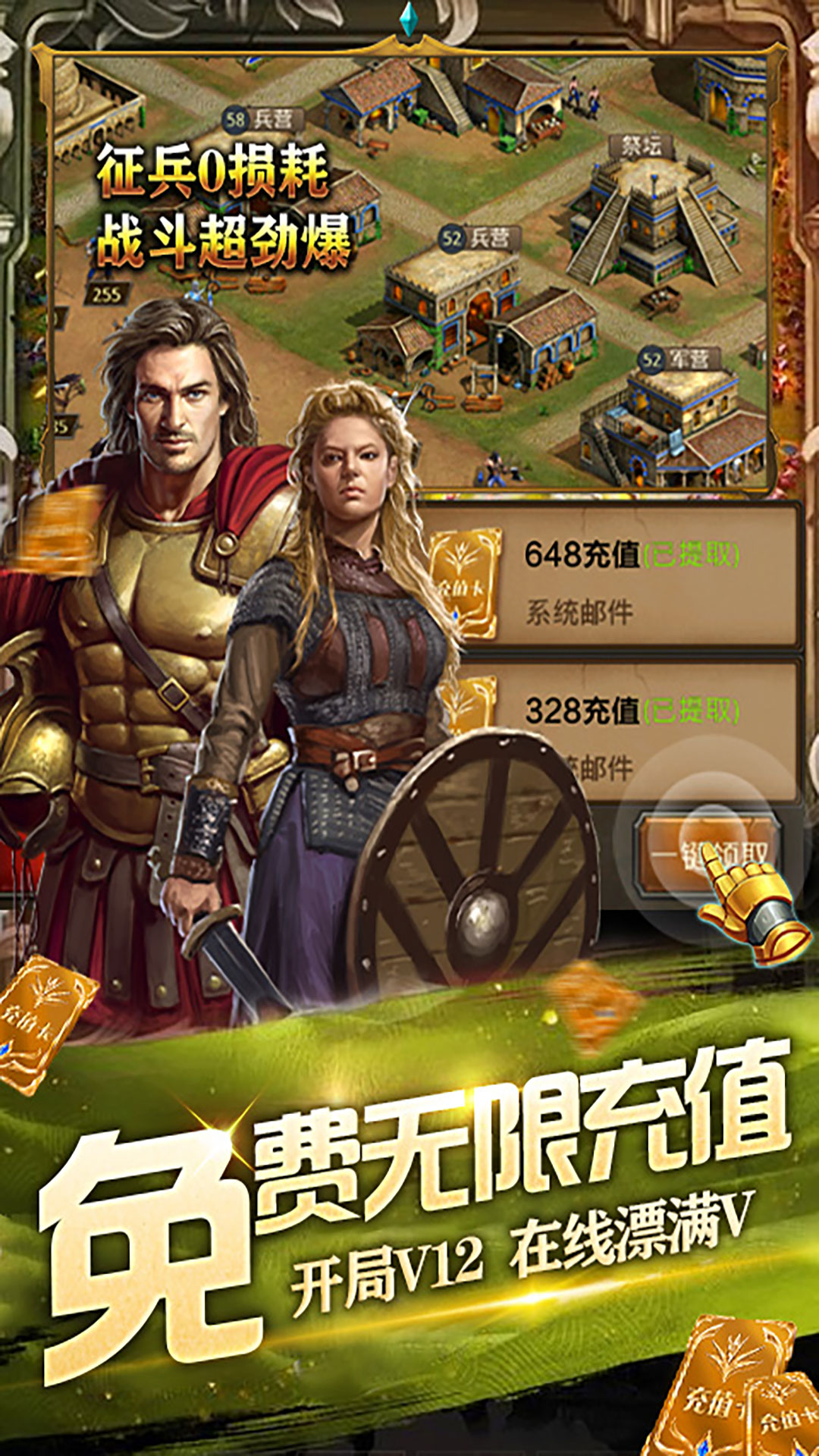 1.充值比例1:500,上线送VIP12,VIP1到VIP12专属礼包无门槛免费领取。2.每日免费点击充值,可激活VIP等级.3.开局即送BUG万抽,保底五星神将哥伦布抽必中,更有每日百连抽。4.开局邮件赠送328充值券,使用后直升VIP16,解锁海量特权。