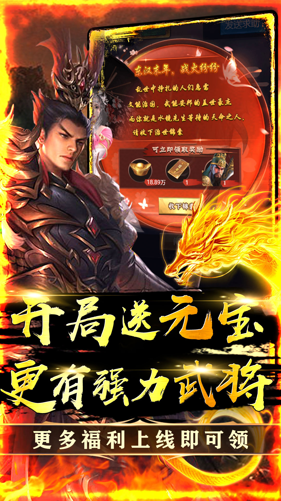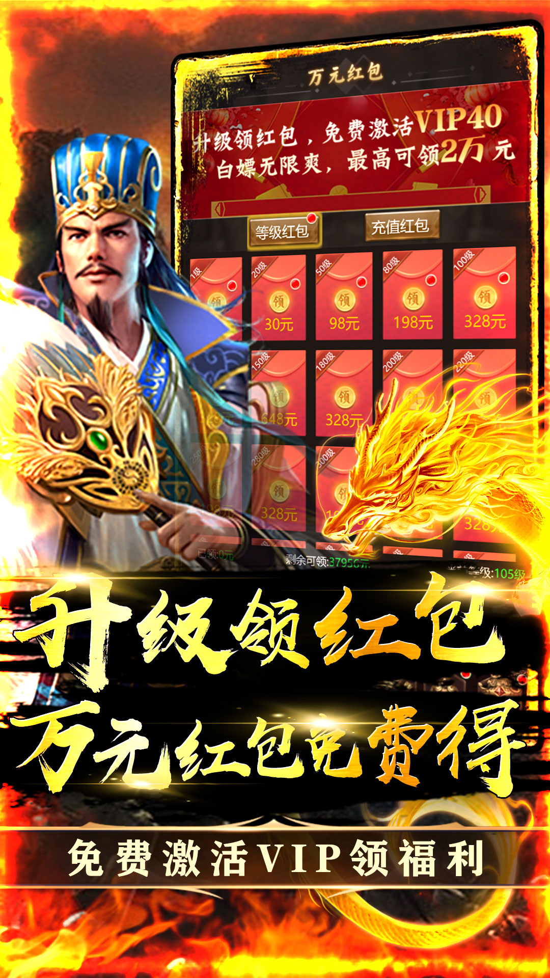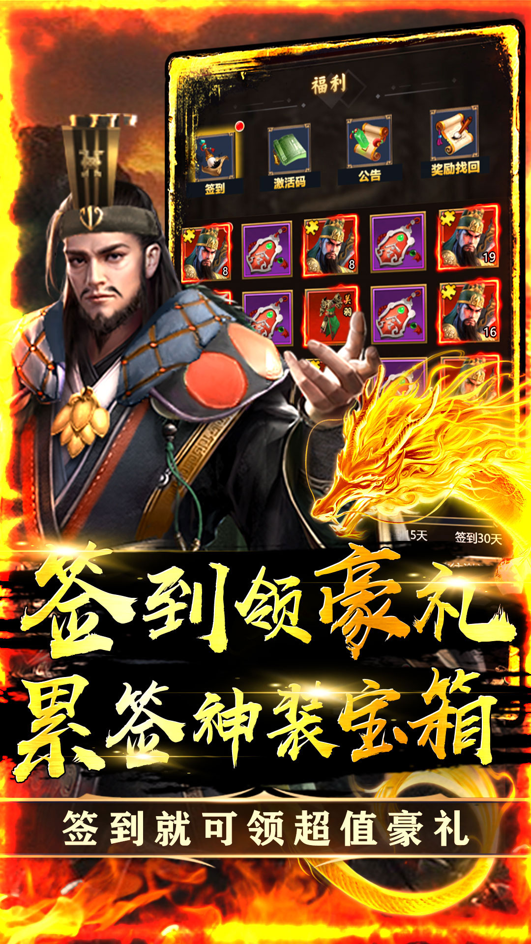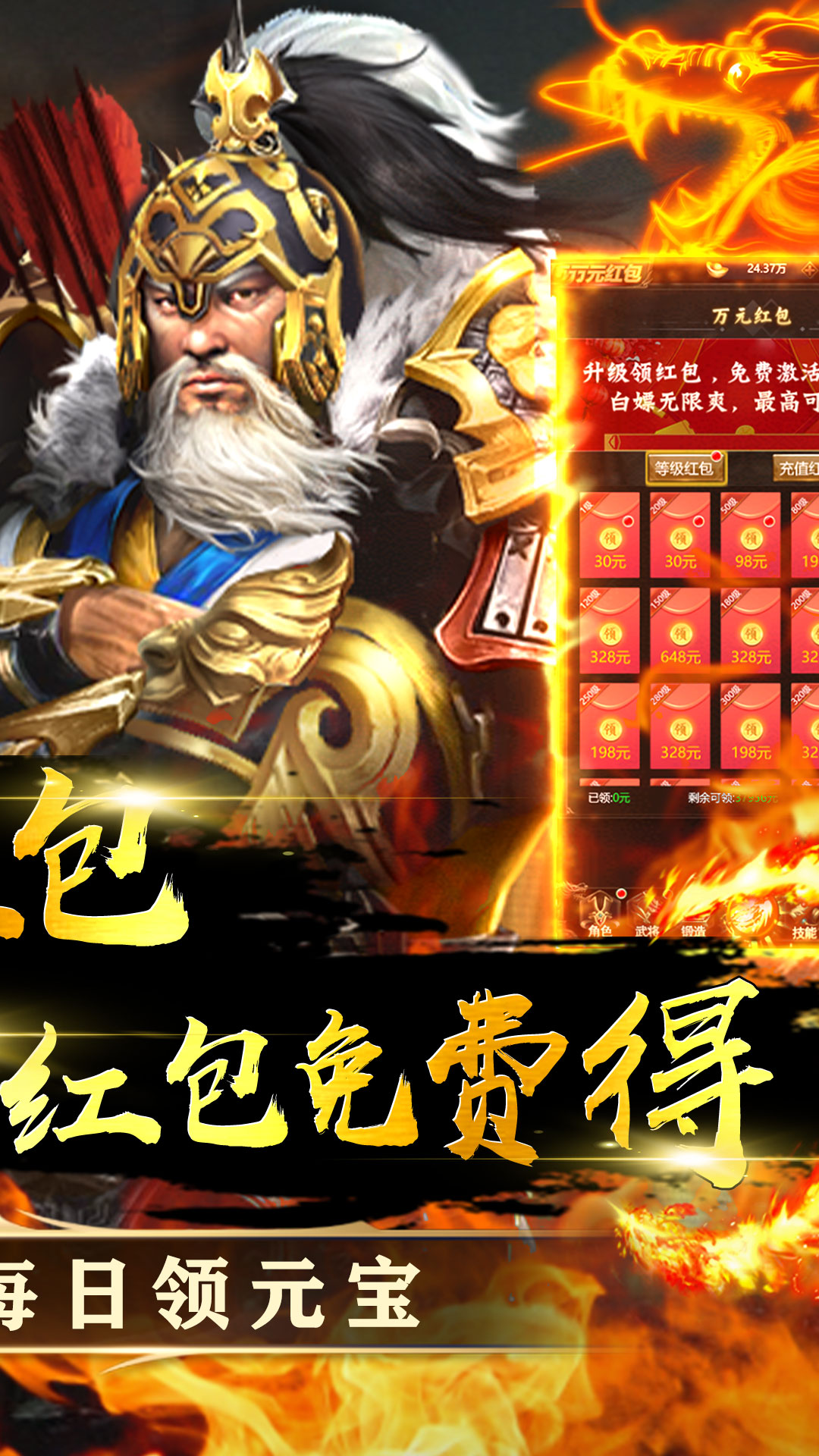 上线即送18万元宝、关羽*1、30元首充卡、VIP151、开局就送VIP、海量元宝、强力武将2、每日签到领超值豪礼,累签更有神装宝箱、兽灵宝箱等你拿3、升级领红包,万元红包免费得,VIP40免费激活!4、登录豪礼每日领元宝