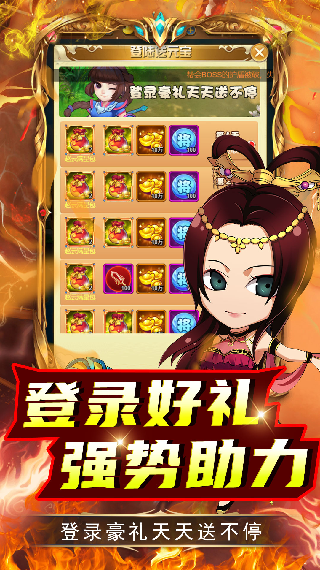 1.新服登录送充值卡、神将包、圣兽、元宝,超级福利2.签到、刷图拿真充,线上活动奖励丰富等你来拿!3.资源商城道具1元宝超级购,强势助力战力飞升4.首续0.1折充值5.赵云满星包签到七日领取