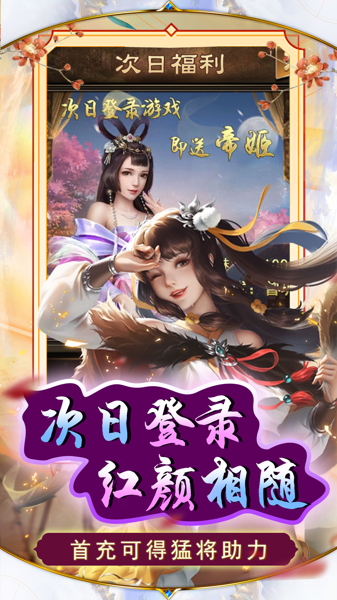 1.每日签到领各种道具,累签领大量元宝2.次日登陆领帝姬!初始魅力100!更有技能加成!3.步步高升,完成任务领取相应奖励,更有折扣礼包等你来购4.首冲任意金额拿猛将“吕布”,助你一臂之力。5.幸运抽奖赢取金条