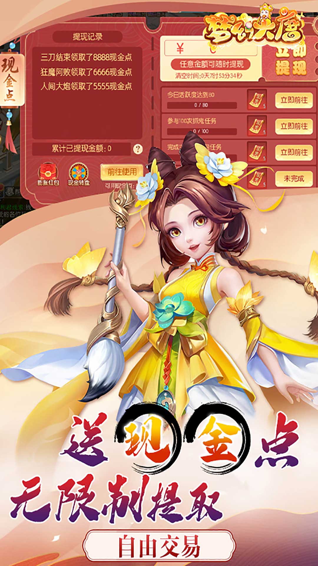 1.每日现金转盘白嫖现金点,可替代RMB直充2.做任务领觉醒3变异圣兽3.上线送神秘宠物蛋4.上线送12888仙玉、88888水玉5.上线送永久时装:仙风道骨6.充值比例1:1000仙玉
