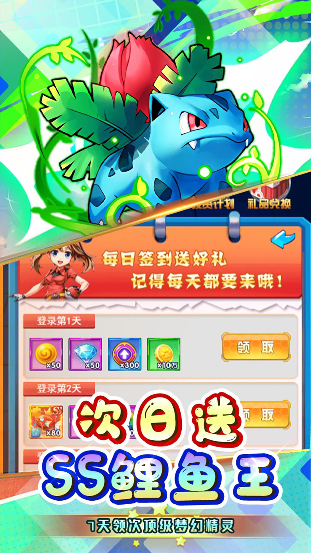 回归经典还原原作,精灵皆可3形态进化全游永久0.1折购,折扣商城再享折上折次日送SS鲤鱼王,7天领次顶级梦幻精灵训练师转职领豪礼,保送最强SSS级精灵签到资源不断,进化SS暴鲤龙指日可待每日活跃任务,免费拿100%捕捉精灵球