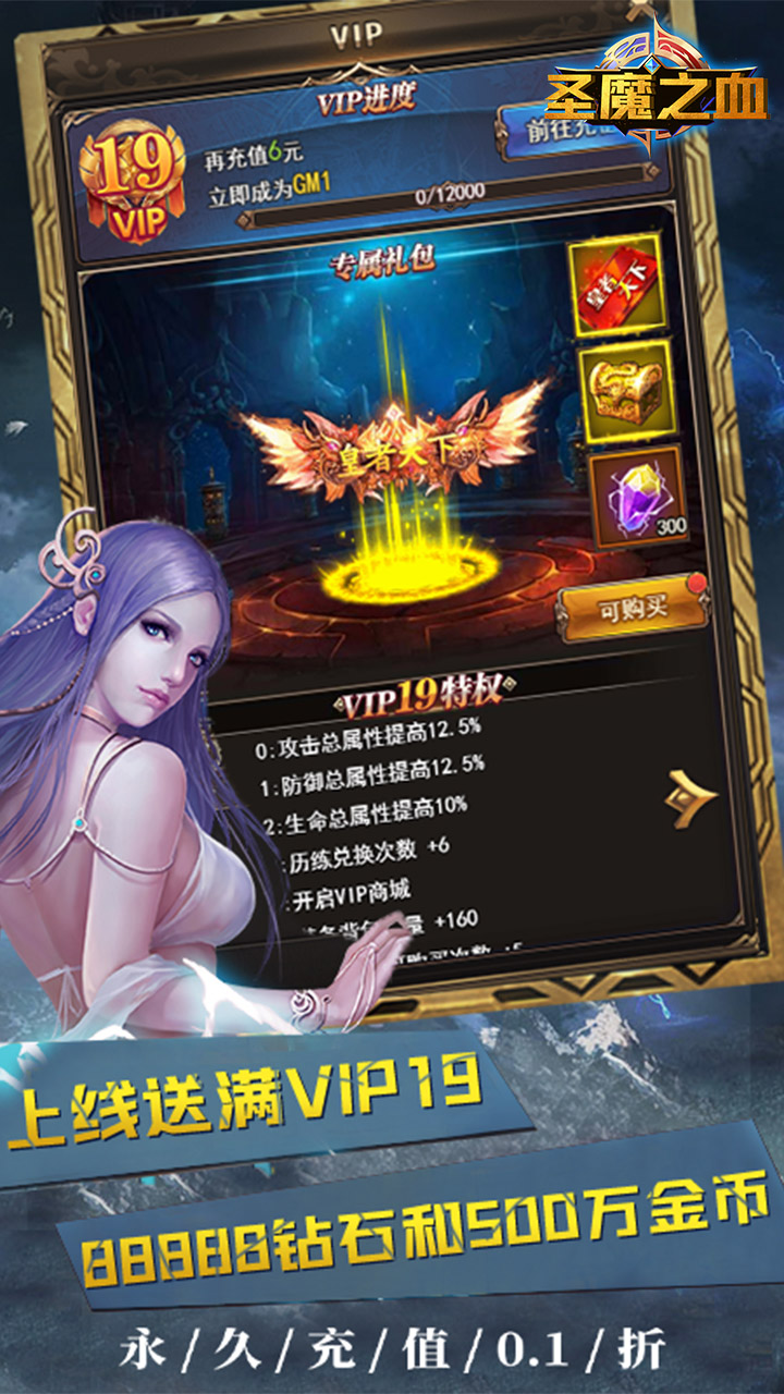 ★创角即送满VIP19,钻石*88888,金币*500万!★累登3天再送6万VIP经验值,直升GM2!免费领取各种VIP礼包!★GM商城1钻石永久购,还有大量材料道具、稀有神器、炫酷坐骑超值购!★每日登录、签到可领取大量钻石、坐骑、宝物和羽翼!★七日登录送大礼,黑龙长剑、法师杀手、梦妖精女神和圣火纹章盾!充值比例1:2000