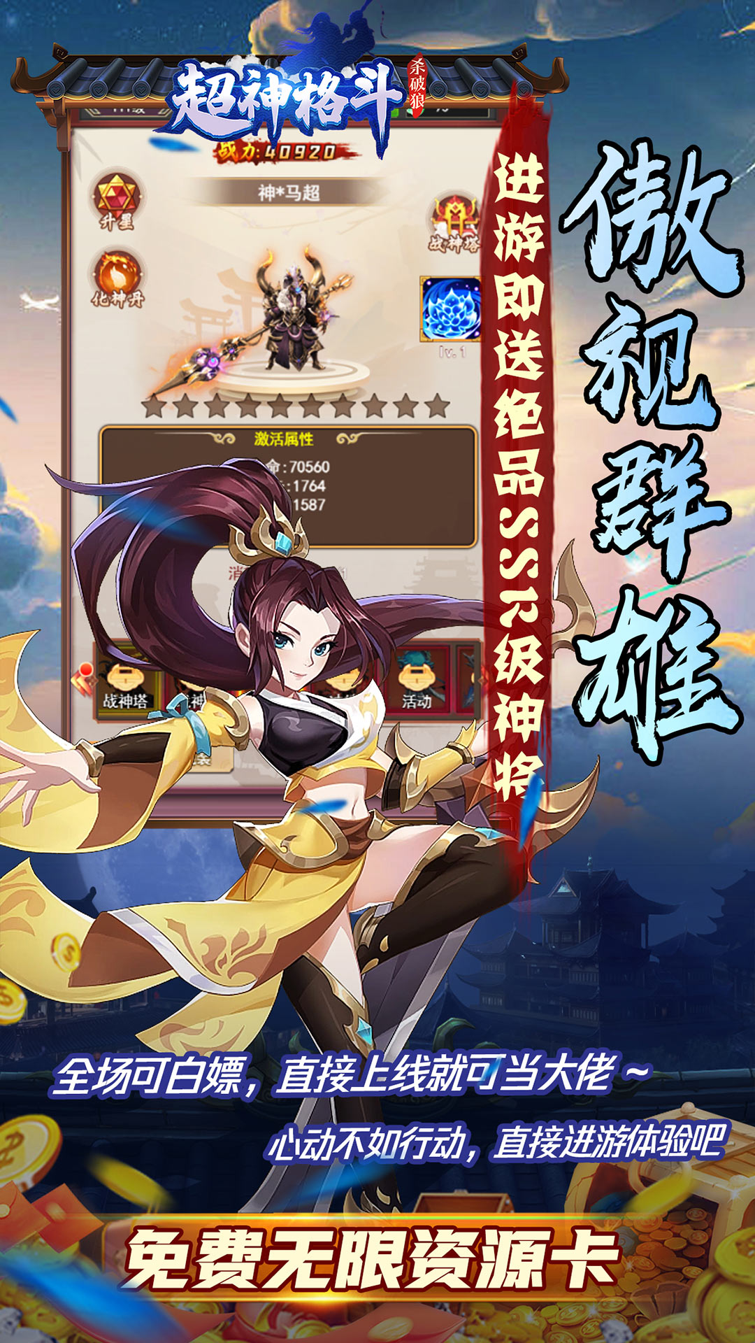 ³¬Éñ¸ñ¶·É±ÆÆÀÇ£¨Õ½ÉñÓÀ¾Ã0.1ÕÛ£©ÊÇÒ»¿îÒÔ¹ú·çÏÉÏÀºÍÈý¹ú±³¾°µÄ·ÅÖùһúµÄÏÉÏÀÓÎÏ·¡£¹Êʽ²ÊöµÄÊÇÉϹÅÊÀ¼Í£¬Ä§×åÒì¾üÍ»Æð»öÂÒ·²¼ä£¬Õ½ÉñÒ»×éÓëħ×åԡѪһվ£¬×îÖÕ½«Ä§ÍõÕòѹ·âÓ¡~ÓÎÏ·»·çϸÄåΨÃÀ£¬¼¼ÄÜÌØÐ§ìÅÀö£¬´ò»÷¸ÐÇ¿ÁÒ£¬¸øÈË´øÀ´ÓäÔõÄÊÓ¾õÏíÊÜ£»È«ÐµĶÀ¼ÒÍæ·¨Ó¦Óо¡ÓУ¬ÈÚºÏÁËÈý¹úÎ佫ºÍÌì×ðħ×ðÔªËØµÄÍæ·¨£¬¼´Ê±½ô´ÕµÄ´ò¶·»úÖÆÈÃÍæ¼Ò³©¿ìÌåÑéÓÎÏ·£¬¹Ò»úÉý¼¶£¬ÐÝÏÐÓéÀÖÖÁÉÏ¡£