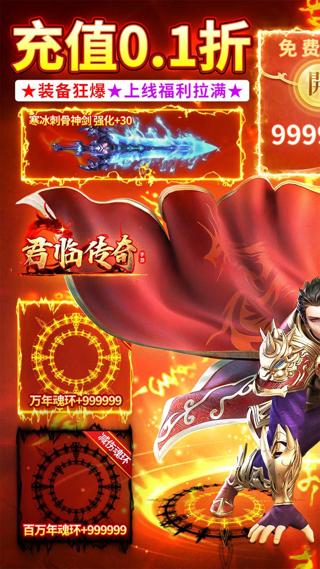 1、永久0.1折,648元只需6.48元2、自由打金,刷怪爆充值,无限刷怪无限爆。3、全新系统:魂环,免氪提升千万年魂环,一刀9999。4、任意首充,刀刀切割,pk砍怪仅需一刀。5、全新炫酷套装,顶级特效,大威天龙!大威天龙!大威天龙!
