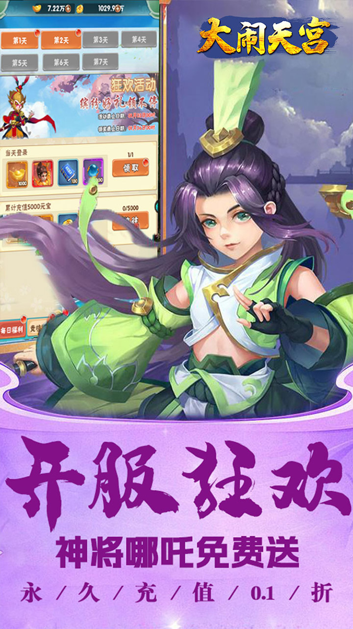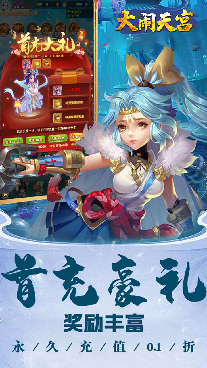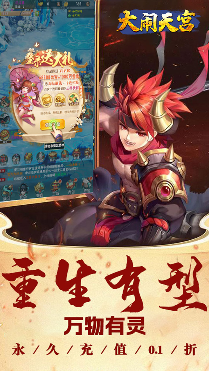 ★创角即送千元真充卡、战宠·妖狐、元宝*68888、金币*1000万等超多福利!★开局10连抽!必中三界伙伴超级橙将!★上线送VIP10!免费领取每日专属福利!★每日签到可领取真充卡、元宝、各种材料道具等!★开服七日狂欢免费送后排输出神将·哪吒、上仙奶爸·太白金星!★西游金库、元宝转盘、一元礼包还有更多惊喜等你来探索!充值比例1:500