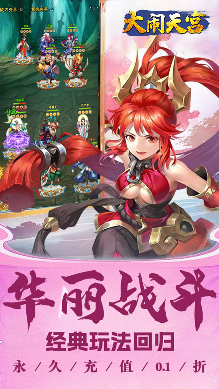 《大闹天宫(0.1折送千充)》是一款Q版人物角色造型的策略卡牌类游戏。开局10连抽!必中三界伙伴超级橙将!创角即送千元真充卡!玩家不仅可以招募各种神将共同征战沙场,还可以烧脑策略组团打BOSS,攻城略地加冕称王,个性化的武将养成、多种副本玩法和PVP跨服PK,等你来战。