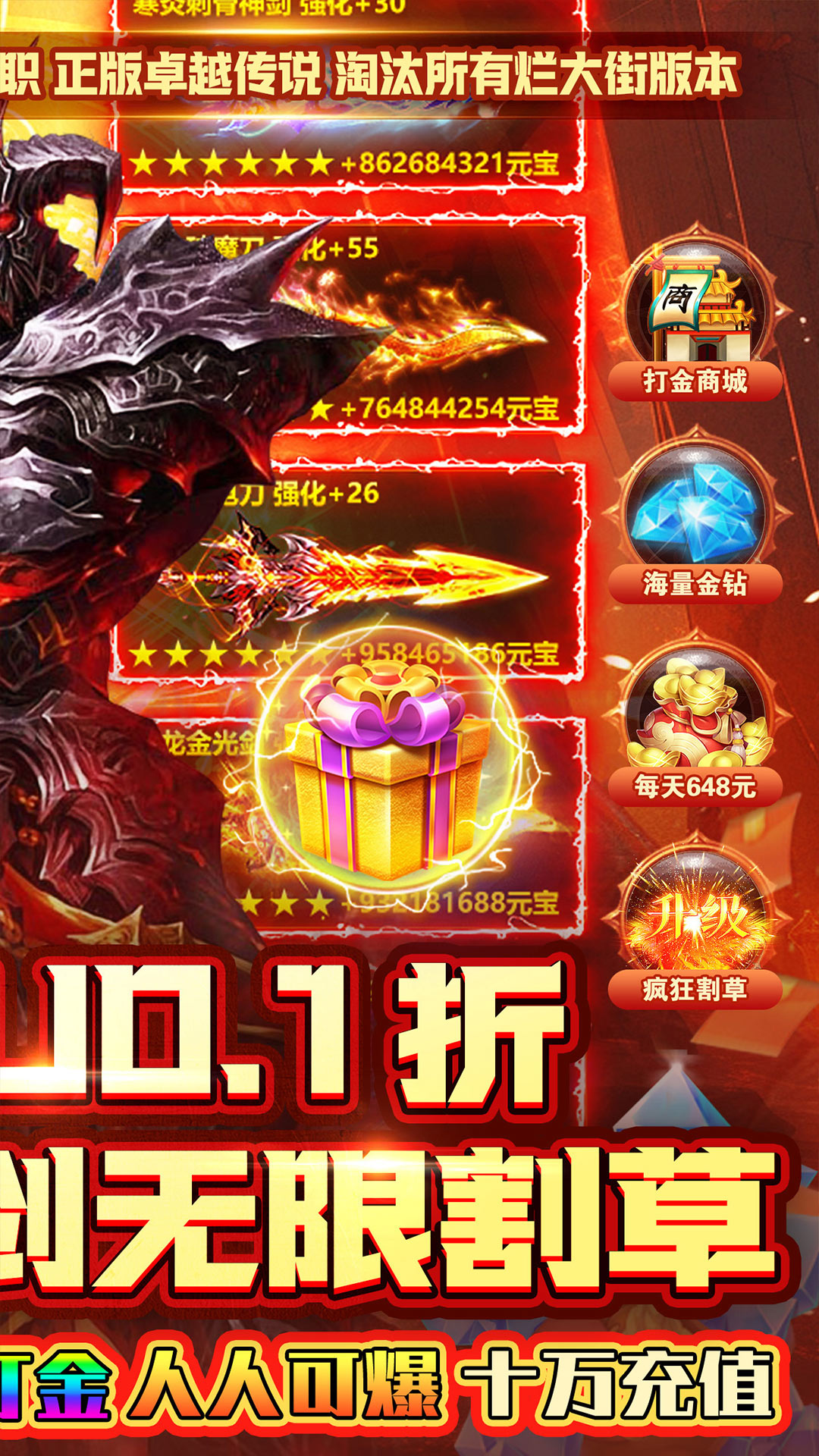 1、送免费充值工具;2、送GM工具海量福利;3、送免费特权直升VIP4、7天登录领UR天使5、全场充值0.1折;6、每日签到无限648充值;7、全屏释放炫酷技能,无限秒杀