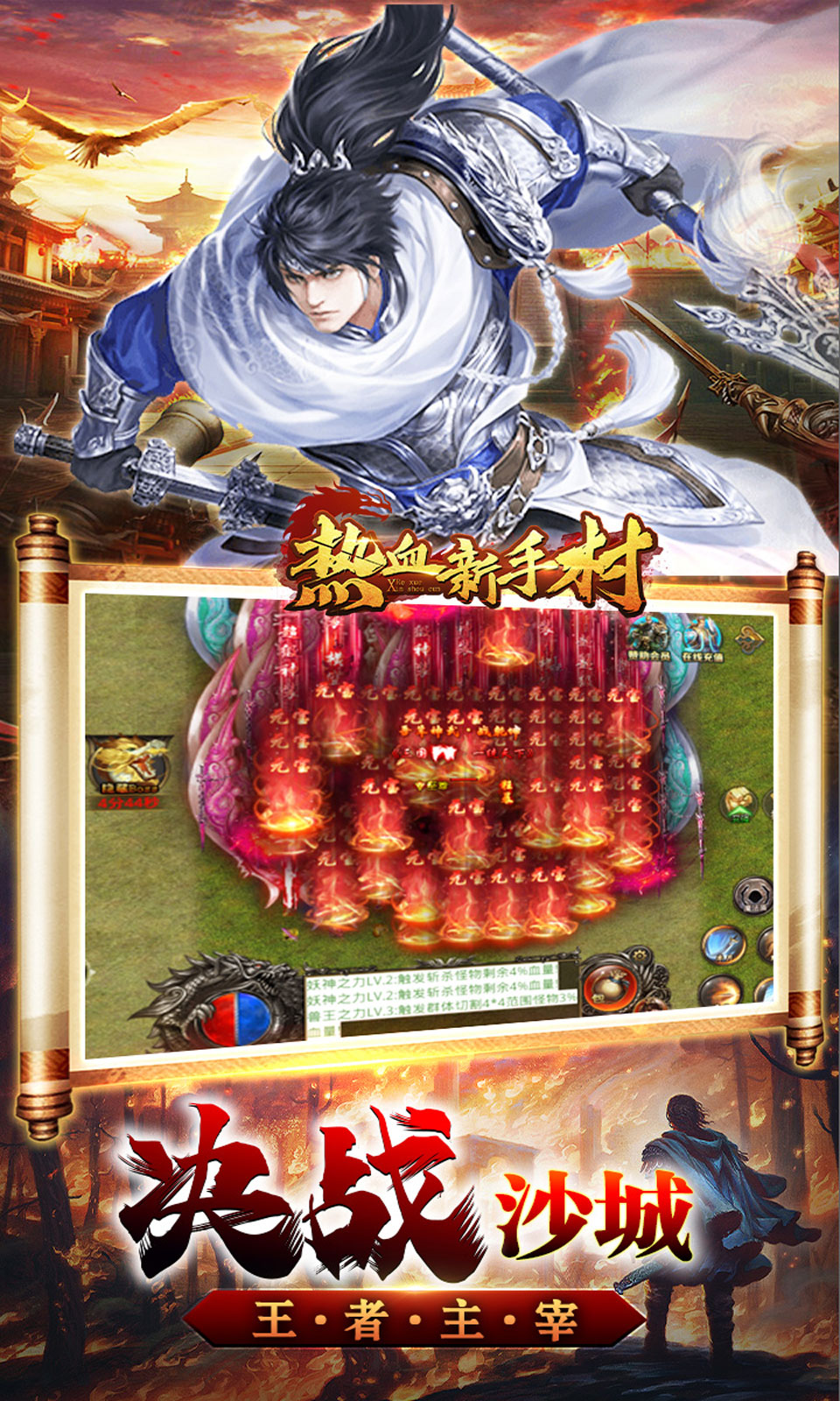2、新手装备、归元丹、自动回收、2W聚灵珠、声望卷轴!3、超高爆率!装备全靠打!0氪也可以玩得畅快!4、回收装备可获得大量货币!5、全新玩法!全新体验!全新属性!5、再战热血沙城!全新攻城沙巴克,准时等你来战!