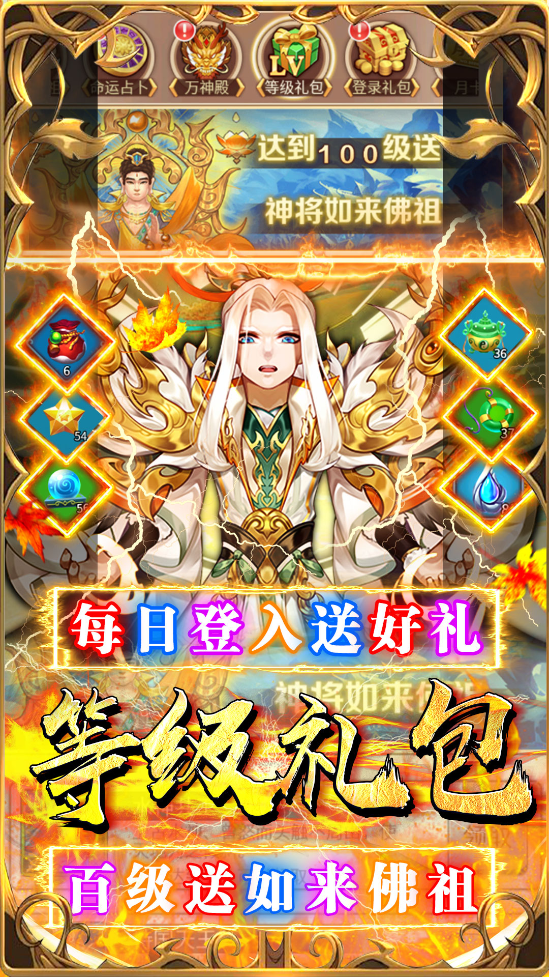 1,登录礼包,每日登录都有好礼相送!2,累计登录奖励海量元宝同时还赠送超多vip经验!3,七日福利,完成七日目标领取神将弥勒佛祖!4,节日活动,登录送豪礼,海量元宝、仙人信物等道具免费领!
