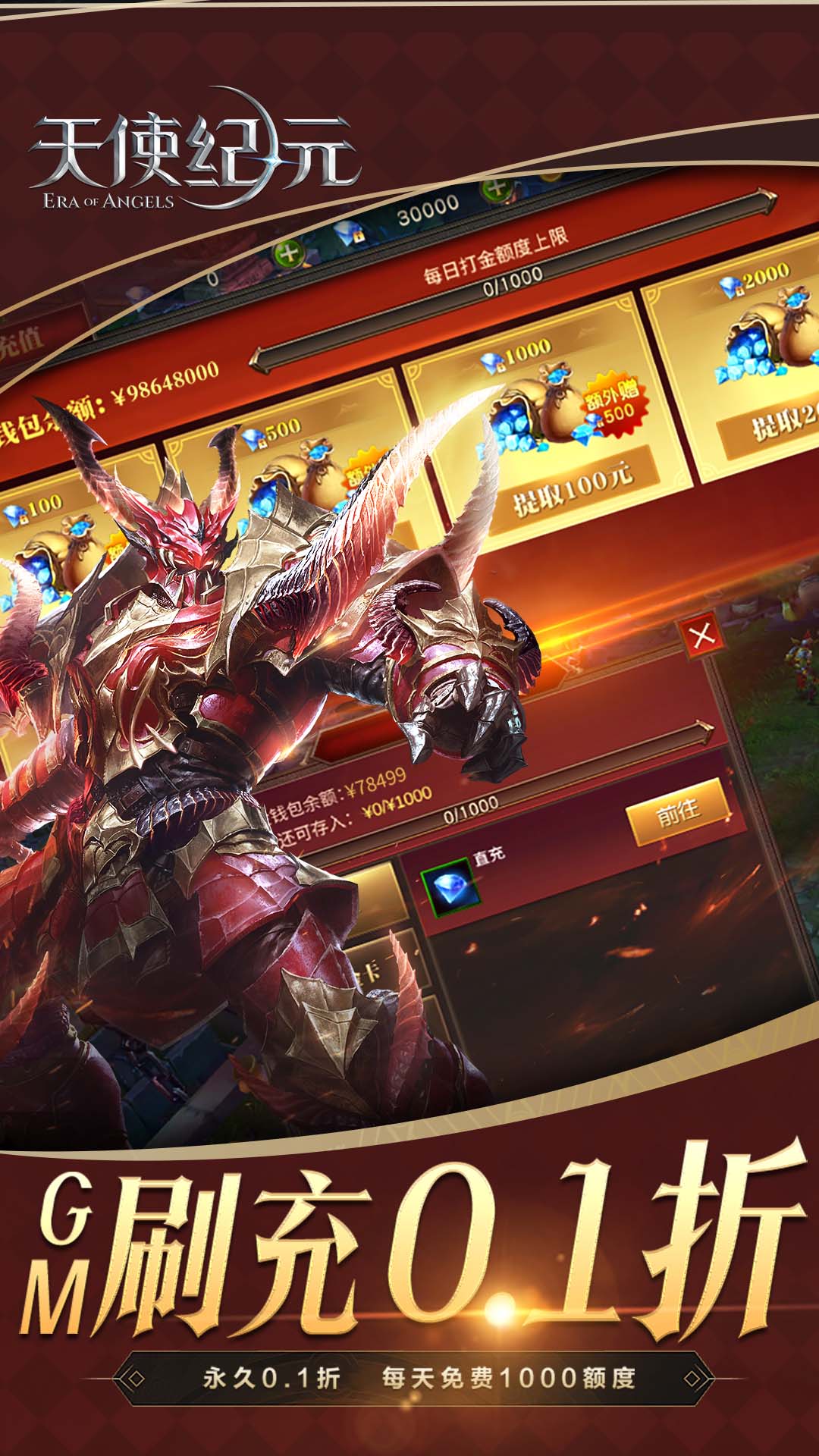 1、充值永久0.1折,首充只需0.06元!原版物价不膨胀,1元当爷2、免费GM刷充,每天免费1000额度!3、上线送独角狂兽,海量金币、绑钻和开局材料4、七日登录每日超炫外观大奖,每天新装不重样5、每月签到送百万绑钻,日常花销再也不愁6、每日在线送百连抽,天天抽到手软